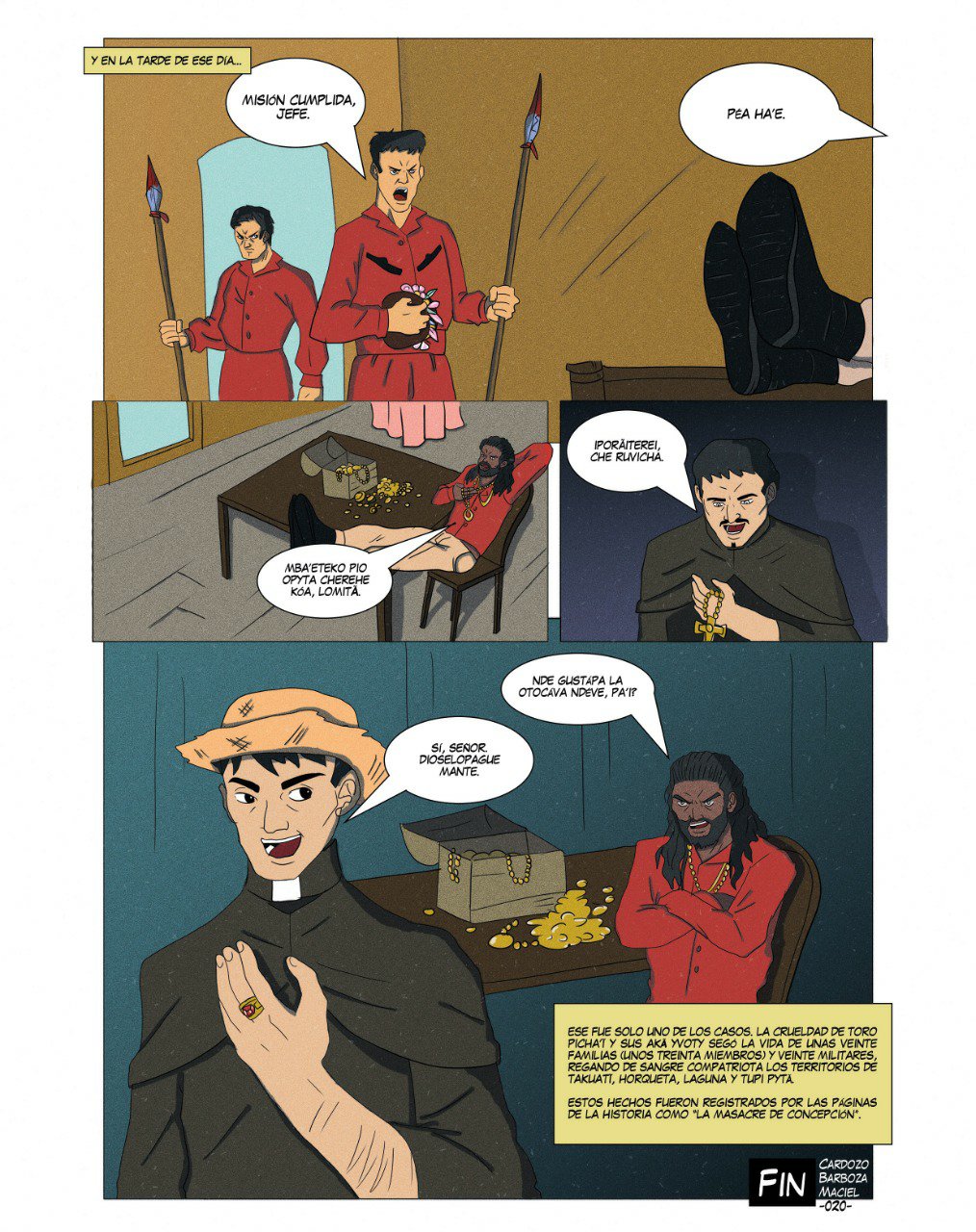 Según el Viveros, gracias al guion del norteño Cardozo y los dibujos del encarnaceno Cristian Barboza y los colores del también encarnaceno Mathias Maciel, uno puede enterarse de las tropelías del nefasto personaje conocido como «Toro Picha’î», que en la página 49 de éste libro trae la historia titulada como «La masacre de Concepción».