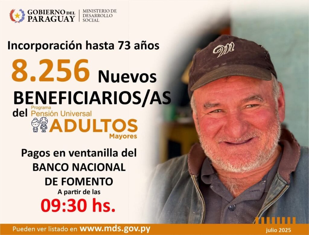 El Ministerio de Desarrollo Social anunció la incorporación de 8.256 nuevos beneficiarios al Programa Universal de Pensiones Alimentarias para Adultos Mayores, como parte del proceso de ampliación del rango etario de acceso al beneficio, que actualmente abarca a personas desde los 73 años de edad.