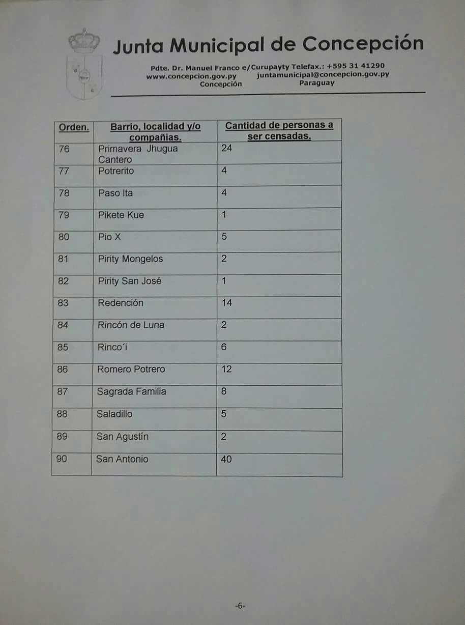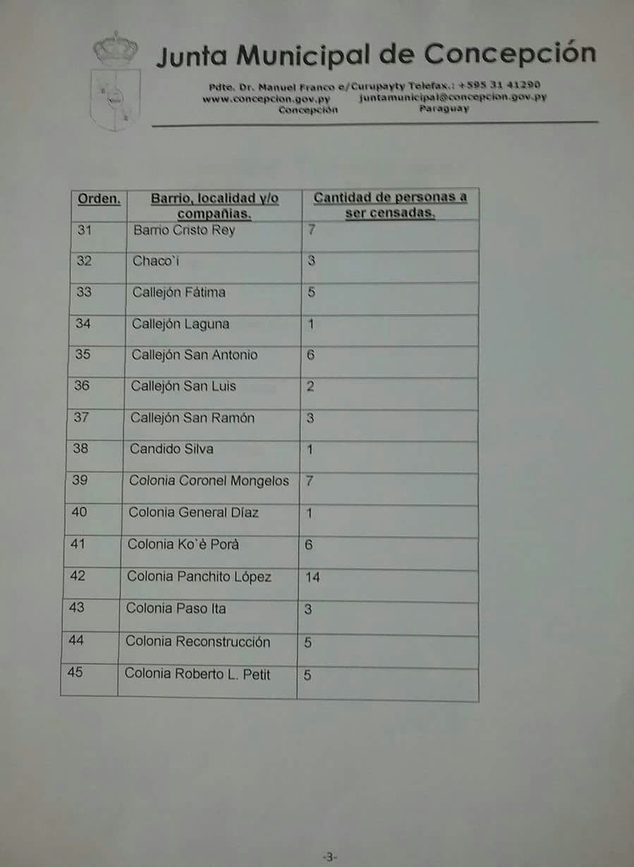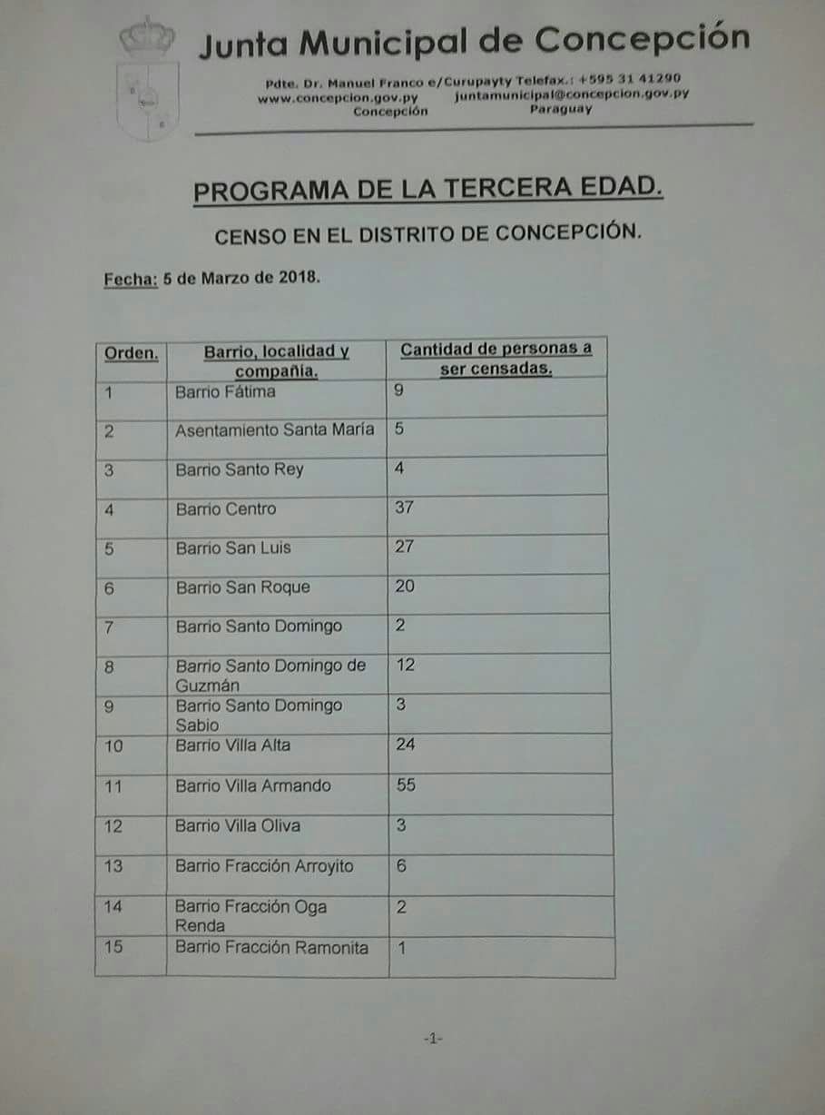 La Junta Municipal de Concepción dio a conocer con la cantidad de adultos mayores que serán censados desde este lunes 5 de marzo, de acuerdo a su barrio, localidad y/o compañía. Segun los responsables se prevé censar a 844 personas.