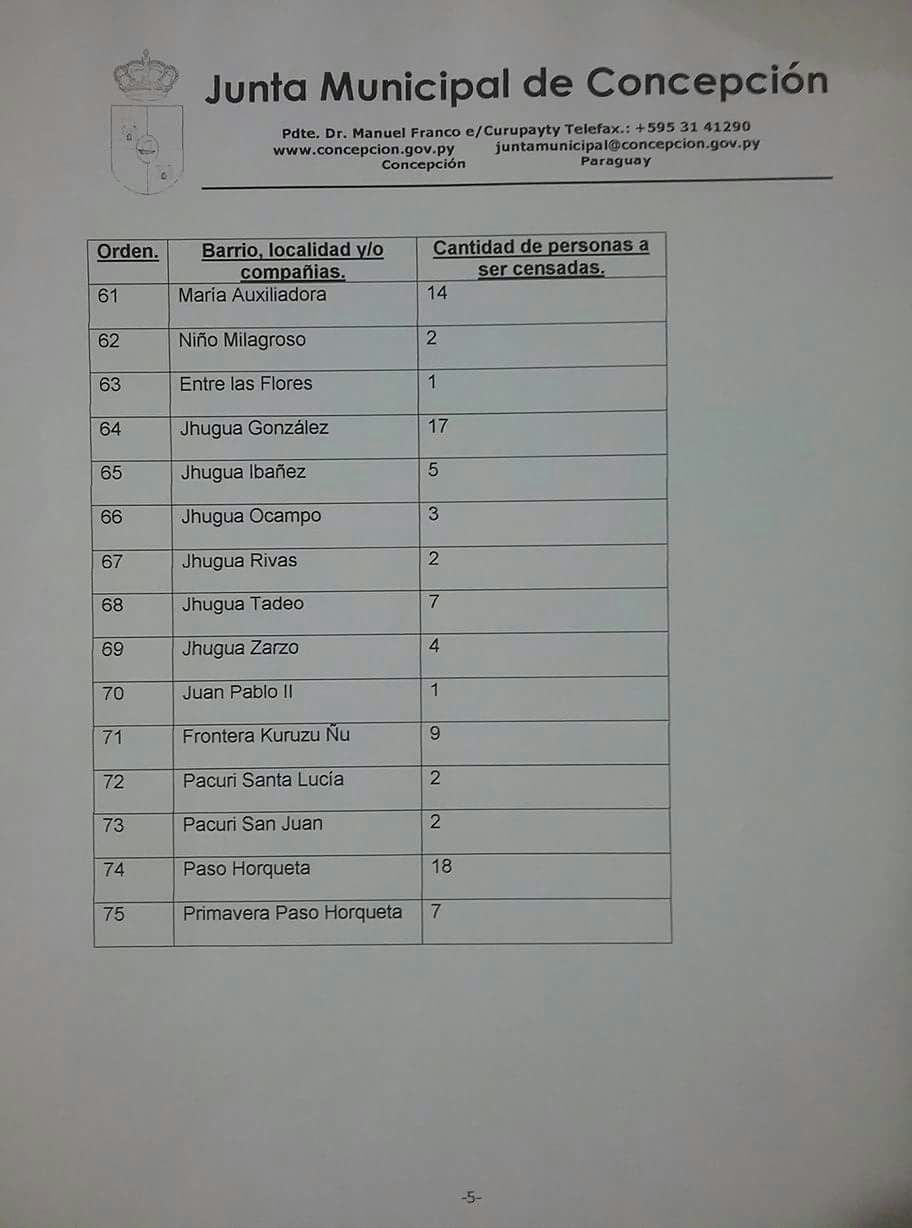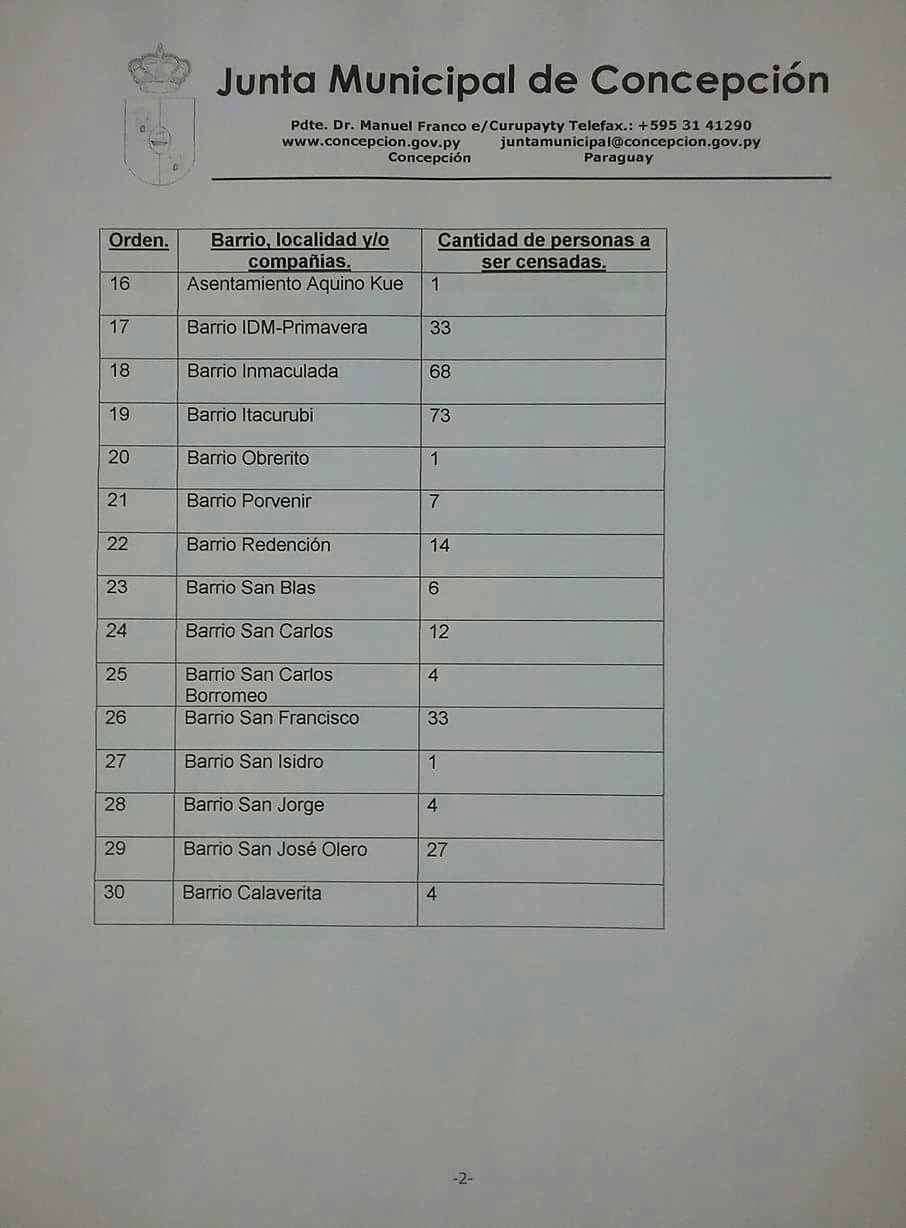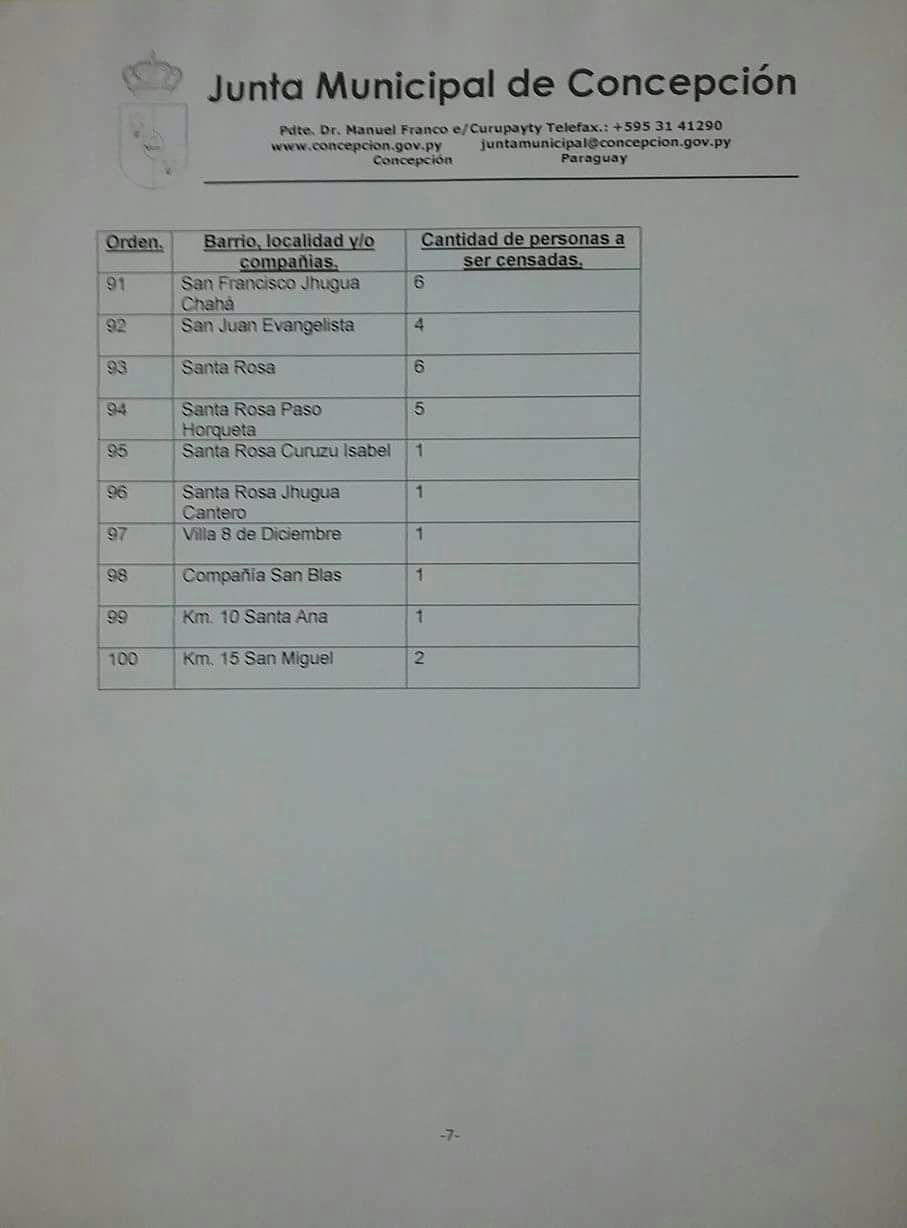 La Junta Municipal de Concepción dio a conocer con la cantidad de adultos mayores que serán censados desde este lunes 5 de marzo, de acuerdo a su barrio, localidad y/o compañía. Segun los responsables se prevé censar a 844 personas.