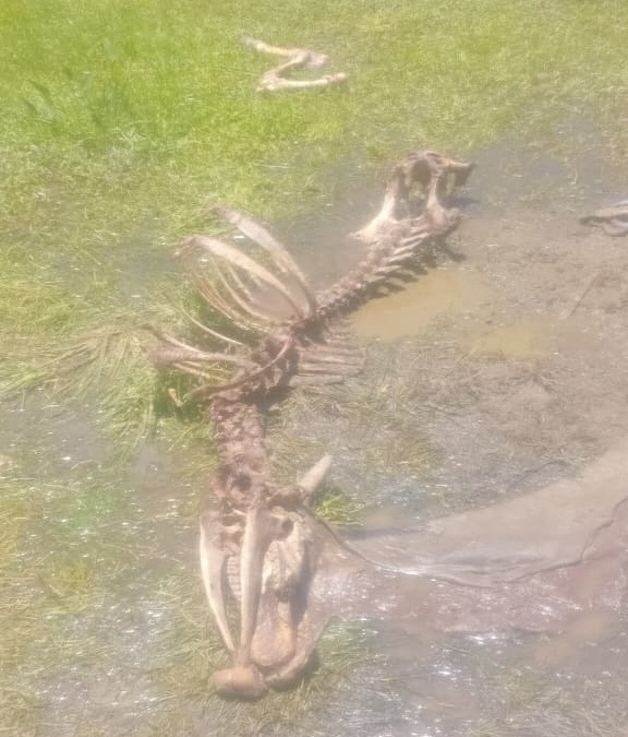 Restos de un animal vacuno hallados en un establecimiento ganadero de la localidad de Laguna Plata, distrito de Paso Horqueta.