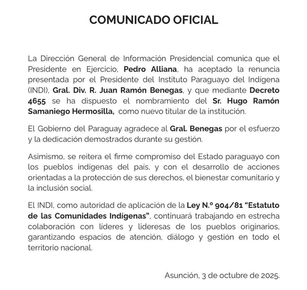 El vicepresidente y presidente en ejercicio, Pedro Alliana, dio a conocer mediante un comunicado oficial la aceptación de la renuncia de Juan Ramón Benegas Ferreira como presidente del Instituto Paraguayo del Indígena (INDI). A través del Decreto N.º 4655, se dispuso el nombramiento de Hugo Ramón Samaniego Hermosilla como nuevo titular de la institución.