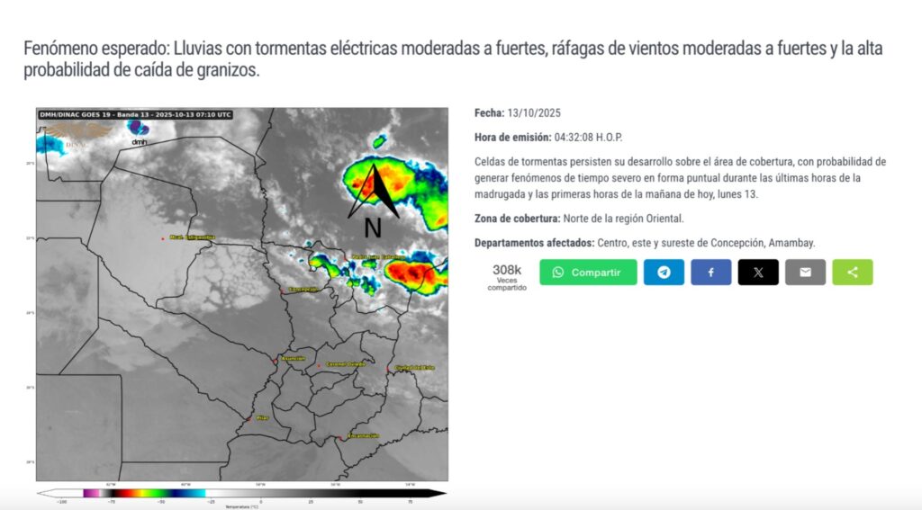 El pronóstico para este lunes 13 de octubre anuncia un amanecer fresco y lluvias dispersas en el norte de la región Oriental, con una posterior mejoría en el transcurso del día. Para los próximos días se prevé un aumento gradual de la temperatura y el retorno de tormentas hacia el jueves.