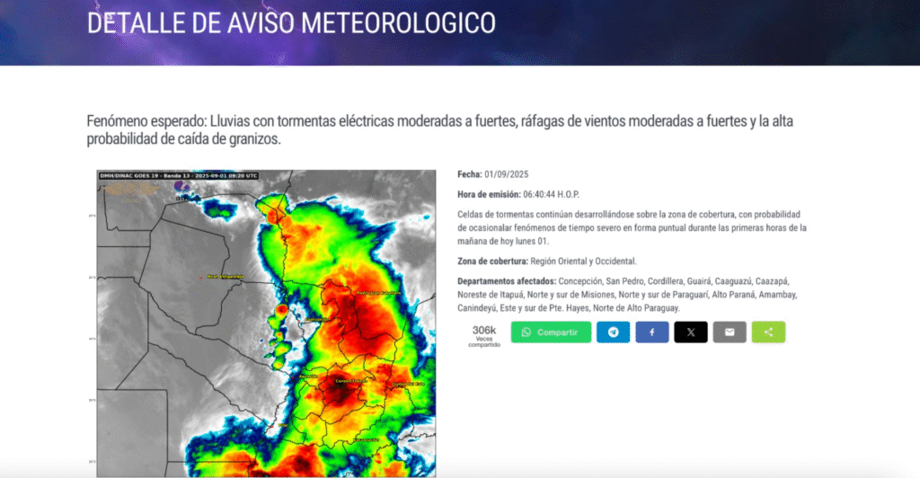 Según la Dirección de Meteorología, este lunes se presentará con cielo mayormente nublado, vientos variables y condiciones favorables para el desarrollo de fenómenos de tiempo severo. Las zonas bajo alerta incluyen Concepción, San Pedro, Cordillera, Guairá, Caaguazú, Caazapá, Itapúa, Misiones, Paraguarí, Alto Paraná, Ñeembucú, Amambay, oeste de Canindeyú y Alto Paraguay.