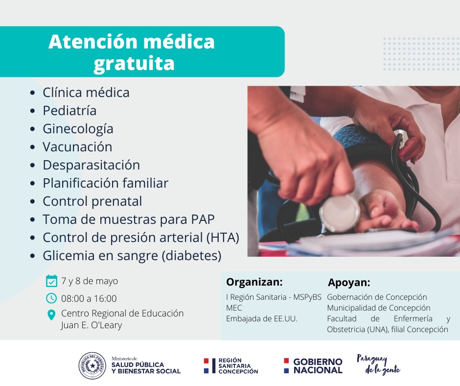 Las atenciones se realizarán los días 7 y 8 de mayo en el local del Centro de Educación Juan E. Oleary de la ciudad de Concepción. Esta atención médica gratuita es organizada por la embajada de los Estados Unidos de América y la Primera Región Sanitaria.