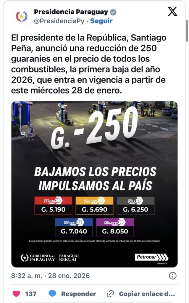 A través de su cuenta oficial en la red social X, el mandatario destacó la importancia del combustible en la economía del país y señaló que esta decisión busca aliviar el bolsillo de las familias paraguayas y fortalecer la producción nacional. “El combustible es el motor que mueve nuestra producción y el día a día de cada familia. Por eso hoy volvemos a anunciar una nueva baja: – 250 guaraníes en todos los combustibles de Petropar”, expresó.