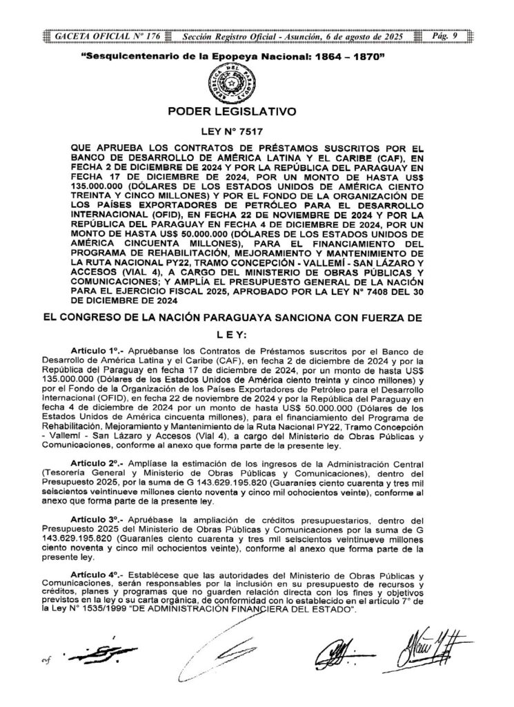 El Poder Legislativo aprobó la Ley N° 7517, que da vía libre a dos contratos de préstamos: uno con el Banco de Desarrollo de América Latina y el Caribe (CAF) por hasta US$ 135 millones, y otro con el Fondo de la Organización de Países Exportadores de Petróleo para el Desarrollo Internacional (OFID) por hasta US$ 50 millones. Los fondos estarán destinados al Programa de Rehabilitación, Mejoramiento y Mantenimiento de la Ruta Nacional PY22, tramo Concepción–Vallemí–San Lázaro y accesos (Vial 4), bajo la ejecución del Ministerio de Obras Públicas y Comunicaciones (MOPC).