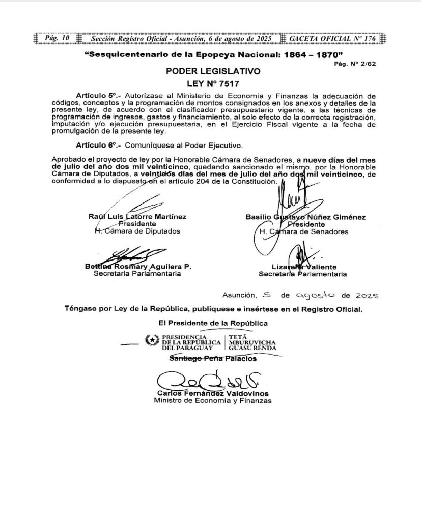 La norma también contempla la ampliación del Presupuesto General de la Nación para el ejercicio fiscal 2025 en G. 143.629 millones, correspondientes a ingresos y créditos del MOPC. El objetivo es garantizar el financiamiento integral de la obra y su ejecución sin interrupciones.