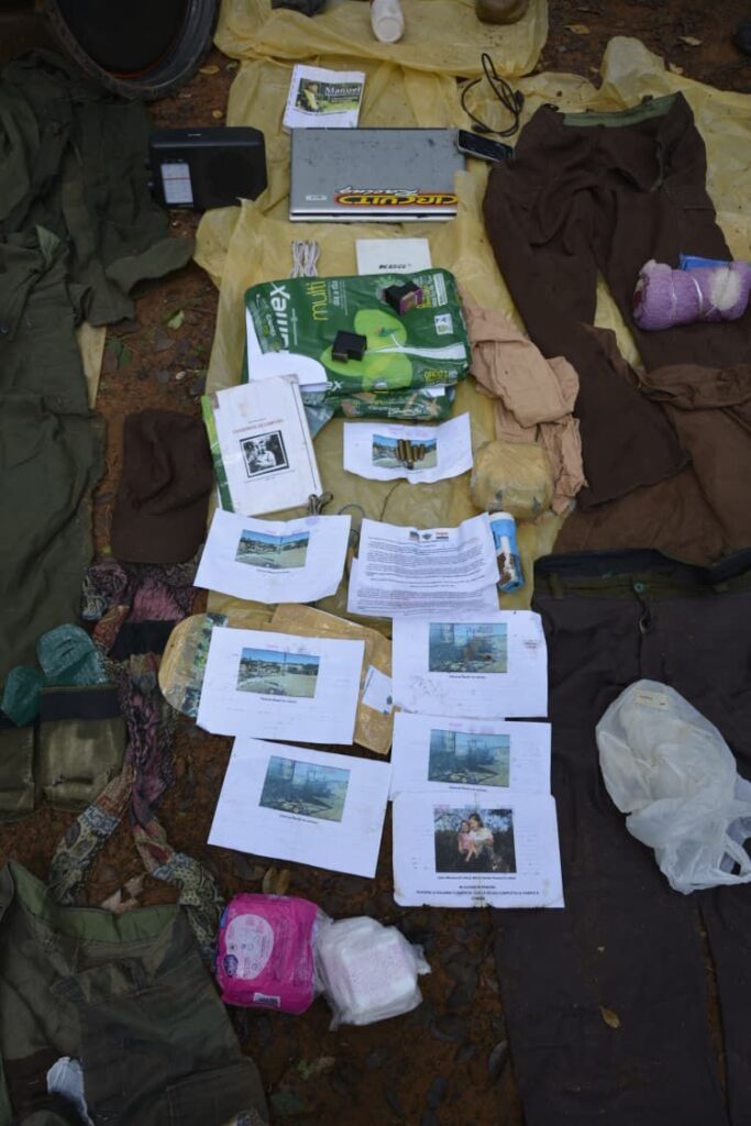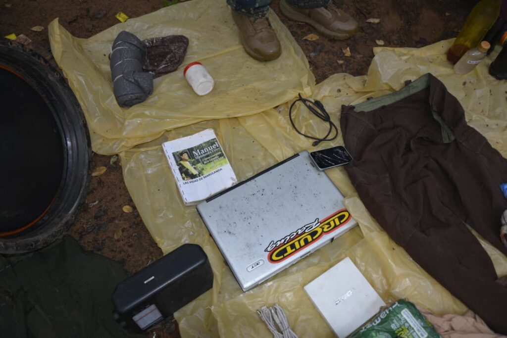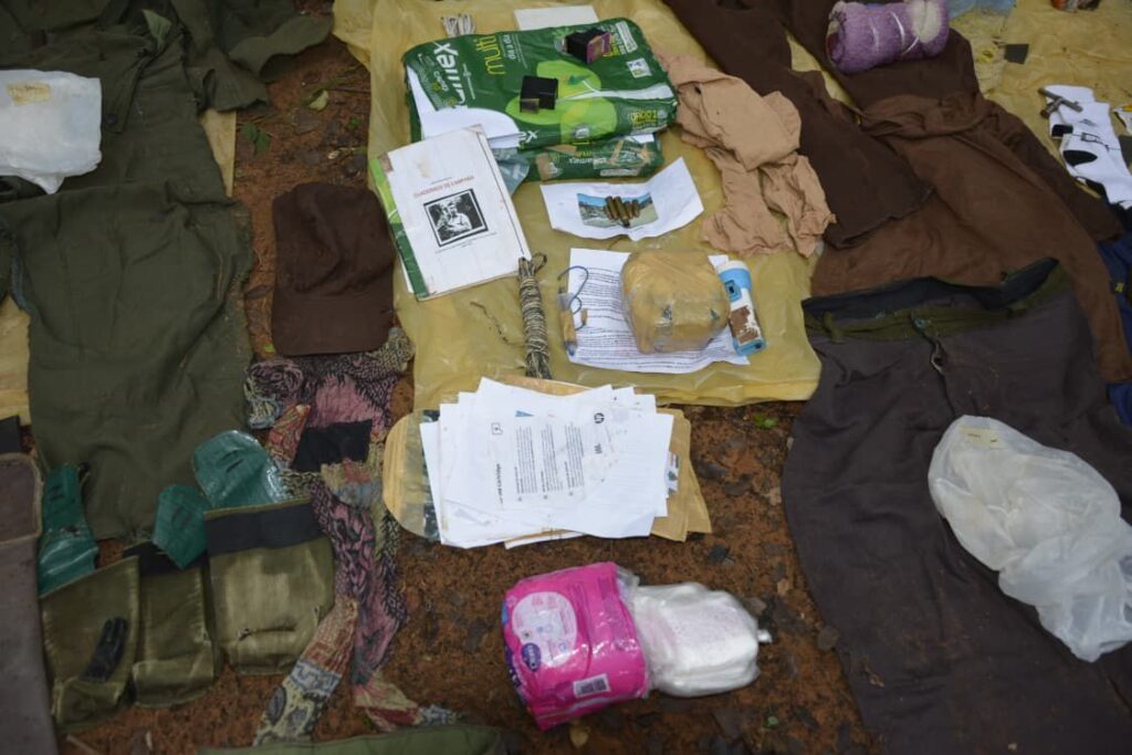 En el interior del depósito oculto se encontraron numerosos objetos que presumiblemente pertenecerían al grupo criminal EPP, entre ellos una notebook marca Acer, un disco DVD con inscripción “KDG”, un teléfono celular Samsung modelo DUO, cuadernos tipo libro de campaña, mochilas, uniformes de color verde, prendas de vestir, una radio portátil marca Sony, paquetes de hojas tamaño oficio y diversas mercaderías.