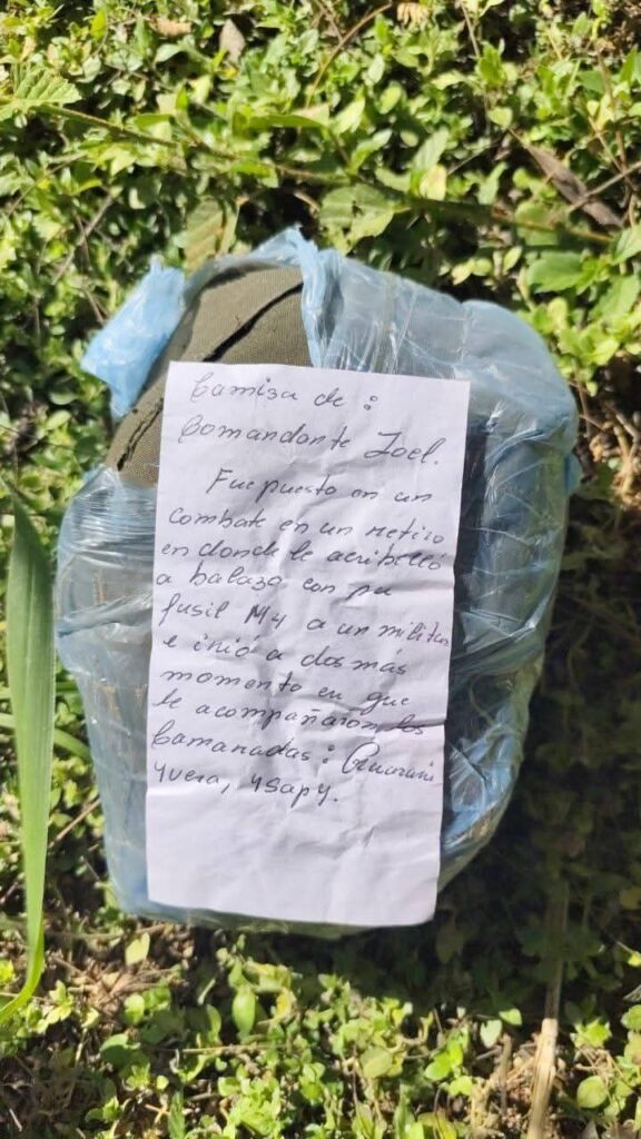 Entre los elementos encontrados, llamó especialmente la atención una camisa acompañada de una nota escrita a mano. El mensaje decía: “Camisa del comandante Joel. Fue puesto en un combate en un retiro en donde le acribilló a balazo con su fusil M4 a un militar e hirió a dos más, momento en que le acompañaron los camaradas: Guaraní (Alejandro Ramos hijo), Yverá (Lourdes Ramírez), Ysapy (Lourdes Ramos)”.