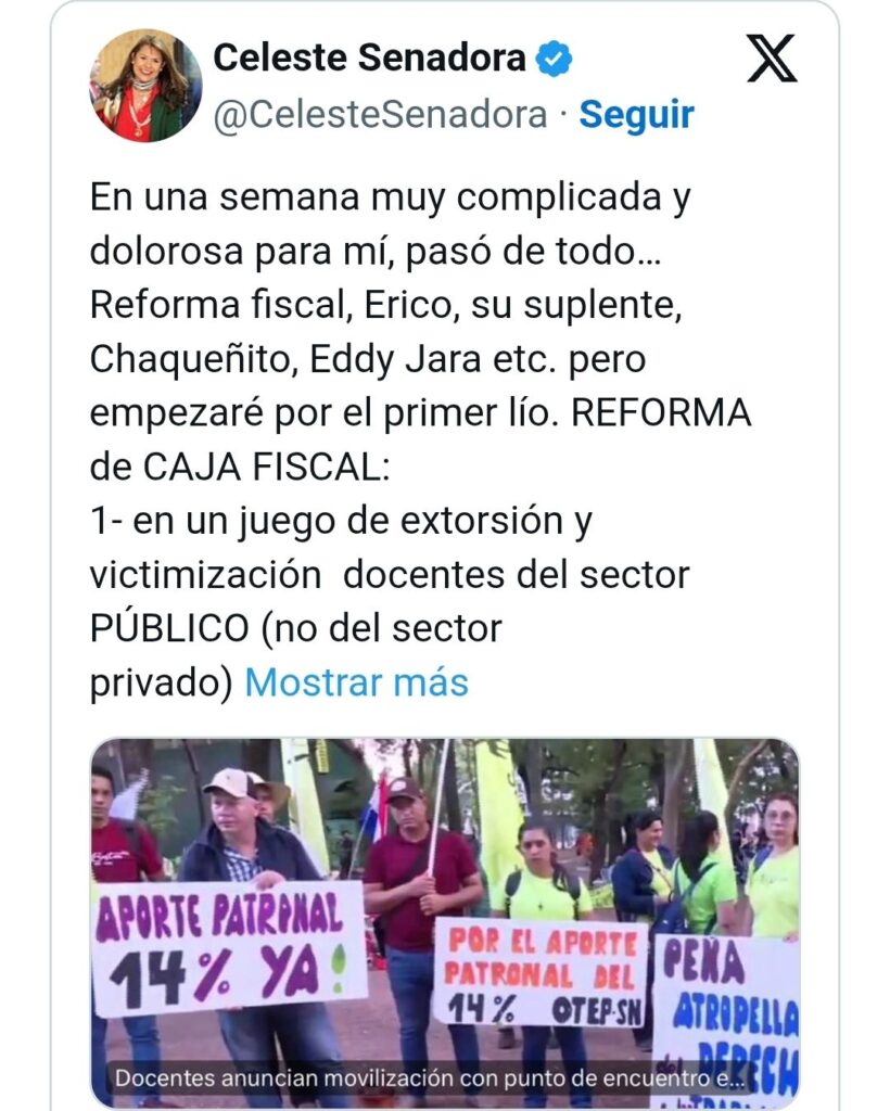 A través de una publicación en la red social X, la senadora liberal Celeste Amarilla se refirió a las negociaciones de la reforma de la Caja Fiscal como un “juego de extorsión y victimización de los docentes del sector público” para conseguir “casi todo lo que pudieron”.