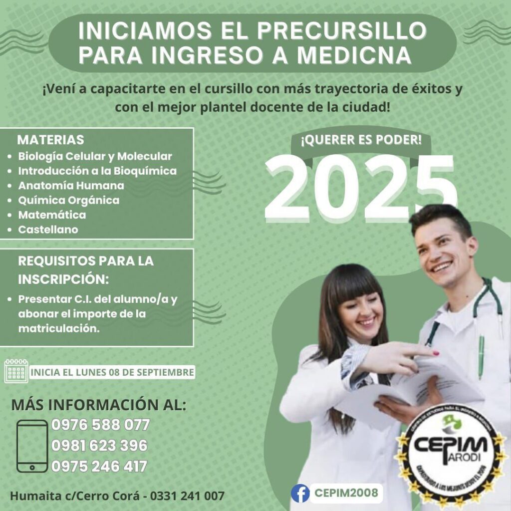 El Centro de Estudios Para el Ingreso a la Carrera de Medicina (CEPIM) anuncia el inicio de su precursillo 2025, dirigido a estudiantes que culminan el colegio este año y desean postularse a la carrera de Medicina en la Universidad Nacional de Concepción en 2026.