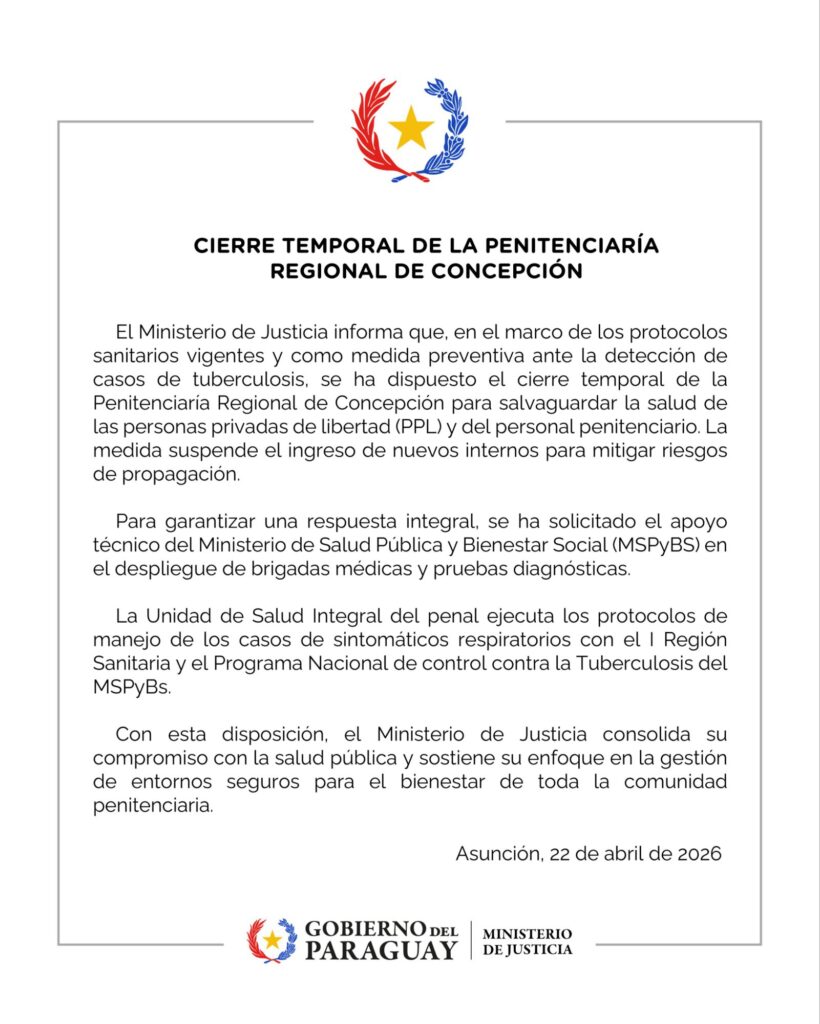 El Ministerio de Justicia dispuso este miércoles 22 de abril el cierre temporal de la Penitenciaría Regional de Concepción como medida preventiva ante la detección de casos de tuberculosis dentro del establecimiento penitenciario.