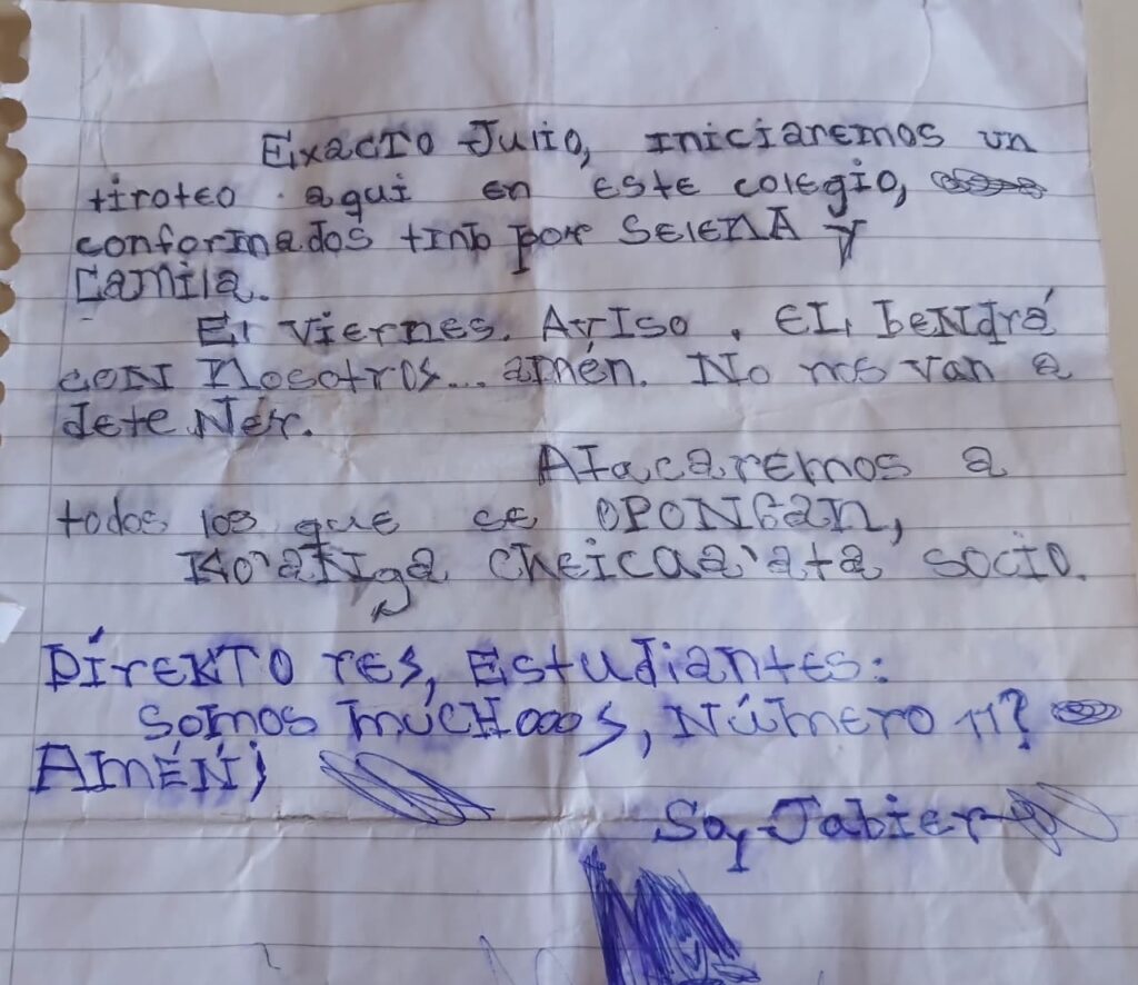 Sobre la nota, la coordinadora confirmó que mencionaba a algunos estudiantes de octavo grado, aunque el nombre de quien la firmó no corresponde a ningún alumno matriculado. “Se van a tomar todas las medidas y llegar hasta las últimas consecuencias. Los sacerdotes ya anunciaron que se investigará a fondo”, afirmó.