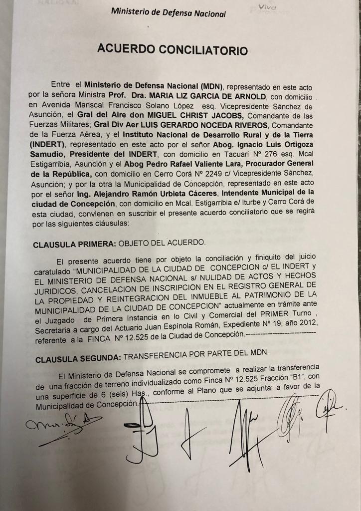 Dos contratos privados fueron suscritos ante la escribana pública Laura Pavón Doldán. El primero fue en fecha 27 de setiembre de 2012 en el que Bernhard Ludwig Julius Thiel entrega el terreno de un poco más de 27 hectáreas. El segundo es la Escritura Nº 3, de fecha 5 de febrero del año 2013, suscripta por la señora Elisabeth Thiel a favor de la Municipalidad de Concepción.