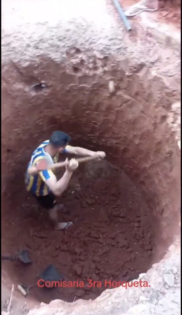 En las últimas horas llegó a nuestra redacción un video correspondiente al año 2023, cuando el uniformado había sido recientemente designado en la Comisaría 3ª de Horqueta. En las imágenes se lo observa con un pico en mano participando en la excavación de un pozo ciego dentro del predio de la sede policial, luego de detectar que las aguas cloacales salían hacia la vía pública.