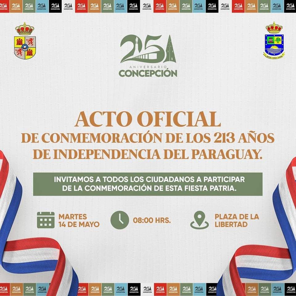La Municipalidad de Concepción organiza un acto conmemorativo para celebrar los 213 años de Independencia del Paraguay, con un acto especial en la Plaza de la Libertad este martes 14 de mayo.