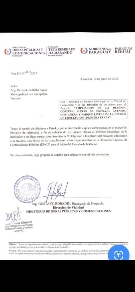 El MOPC remitió una nota oficial al Ejecutivo solicitando el permiso municipal y la no objeción a los planos del proyecto, documentos necesarios para cumplir con los requisitos exigidos por la Dirección Nacional de Contrataciones Públicas (DNCP) y avanzar con el llamado a licitación.
