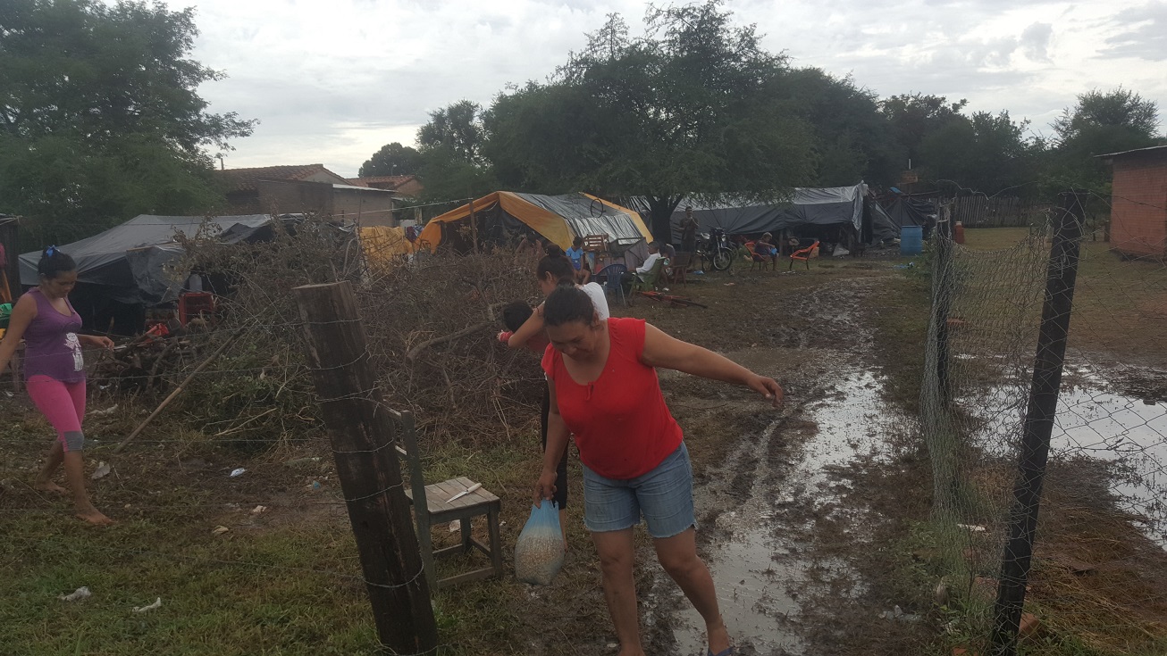 Varias familias que abandonaron sus viviendas por el desborde del río Paraguay y se reubicaron en lugares más altos en el mismo barrio, ahora pasan odisea porque el inmueble donde levantaron sus precarias carpas se llena de aguas y charcos después de las lluvias.