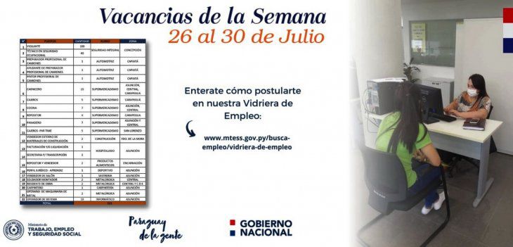Las personas interesadas en postularse pueden hacerlo a través del siguiente enlace: https://www.mtess.gov.py/busca-empleo/vidriera-de-empleo, donde semanalmente se van actualizando todas las vacancias disponibles, con indicación del perfil requerido por las empresas. Para el departamento de Concepción se requieren 100 vigilantes y 40 técnicos en Seguridad Ocupacional; además una empresa de Capiatá solicita preparador profesional de camiones, pintor profesional de camiones y ayudante preparador.
