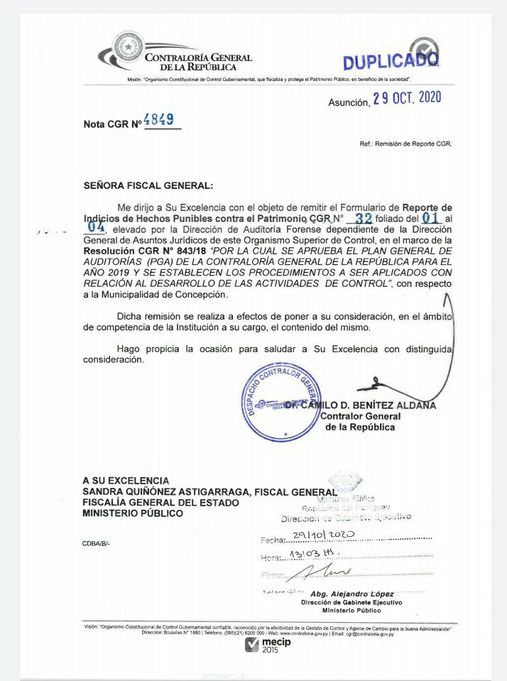 La denuncia fue presentada ante el Ministerio Público por el Dr. Camilo Benítez Aldana, Contralor General de la República.