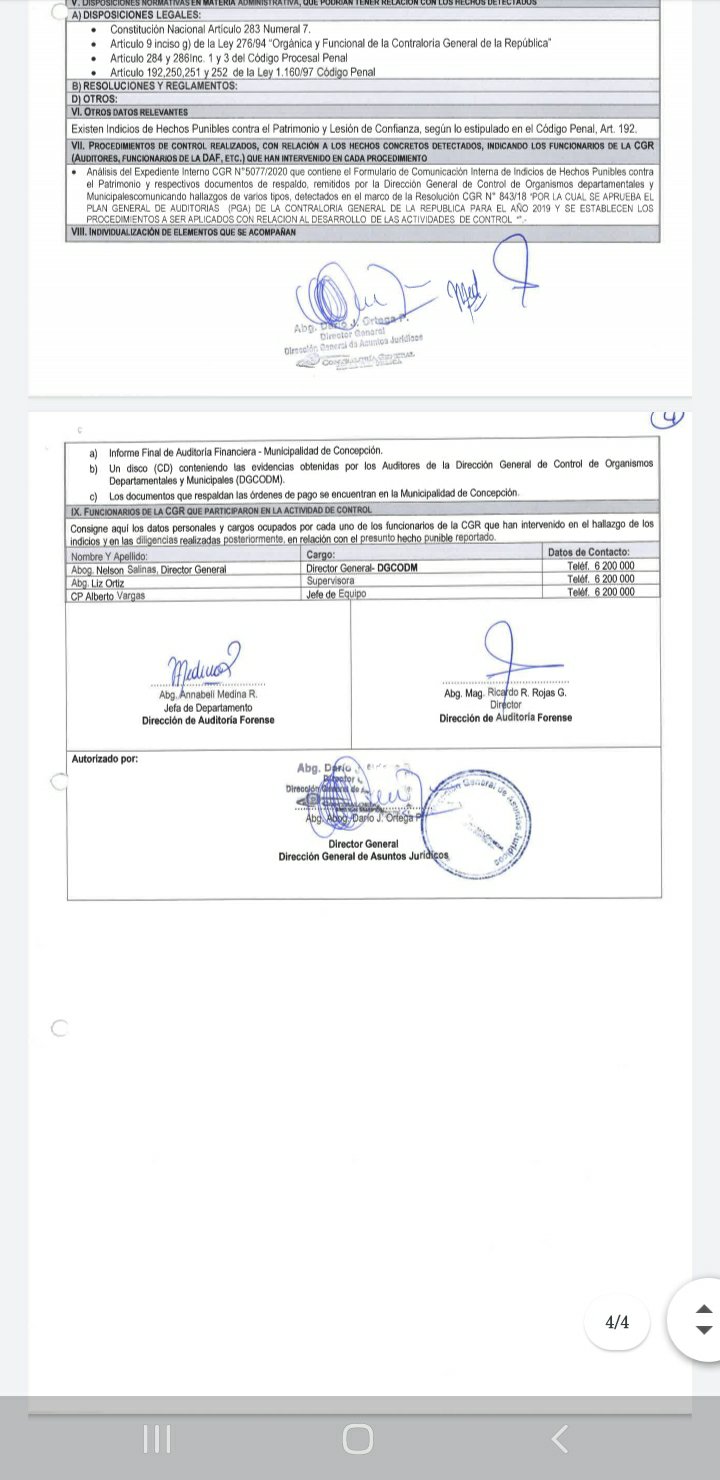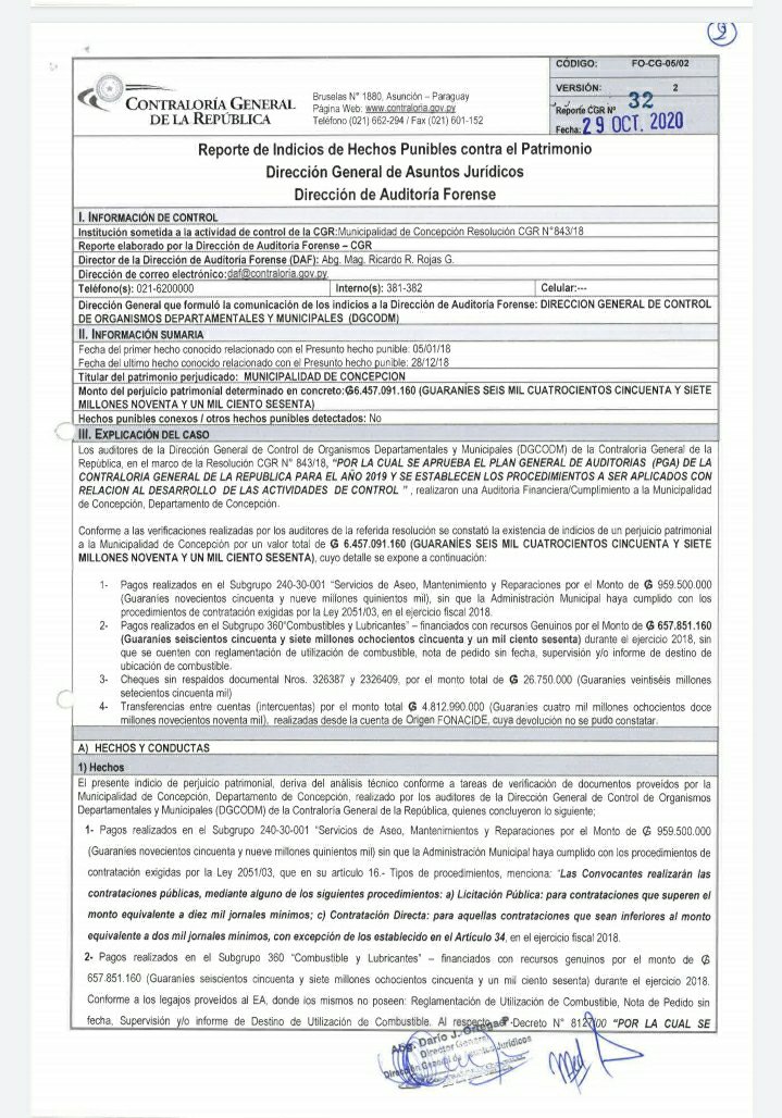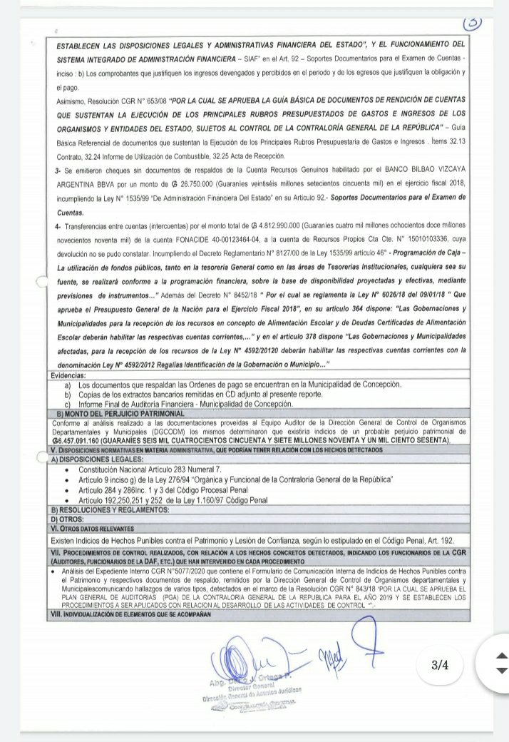 Conforme a las verificaciones realizadas por los auditores de la Contraloría General de la República se constató indicios de un perjuicio patrimonial a la Municipalidad de Concepción por un valor total de Gs. 6.457.091.160 en la administración del jefe comunal Alejandro Urbieta.