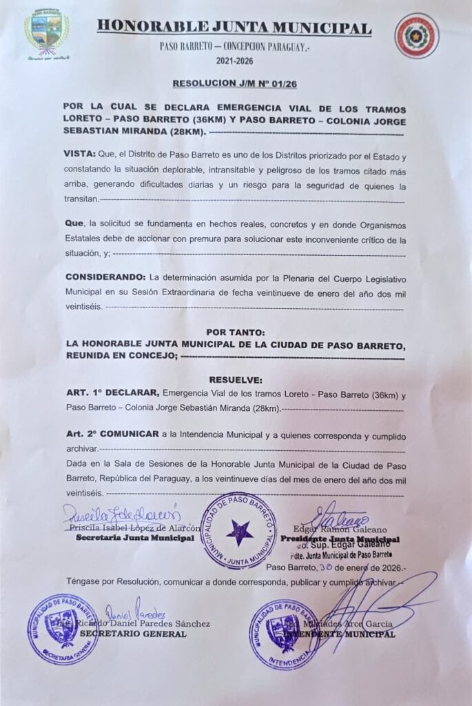 La resolución señala que Paso Barreto es uno de los distritos más afectados por el estado intransitable y peligroso de los tramos Loreto–Paso Barreto, de 36 kilómetros, y Paso Barreto–Jorge Sebastián Miranda, de 28 kilómetros, situación que se agrava tras cada lluvia. En ese contexto, los concejales resolvieron en sesión extraordinaria solicitar la intervención urgente de las autoridades departamentales y nacionales para la reparación del camino.