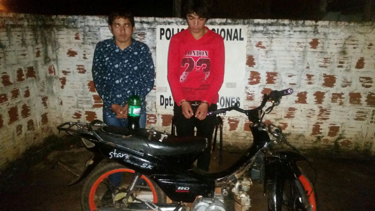 La aprehensión obedeció a la exposición a peligro en el tránsito terrestre que derivó en la incautación de una motocicleta de dudosa procedencia y puñales, resultando demorados; Lino Ramon Maldonado (18) y Brahian Javier Monzon Lopez (19) e incautados; una motocicleta, marca star, modelo sk110 reforzado, color negro, sin chapa y 2 puñales de aproximadamente 25 cm. de largo y bebida alcohólica.
