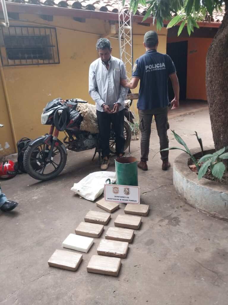 El hombre fue detenido en la vía pública de la ciudad de Concepción, el mismo transportaba en una motocicleta unos 10 kilos de cocaína ocultos en una garrafa.