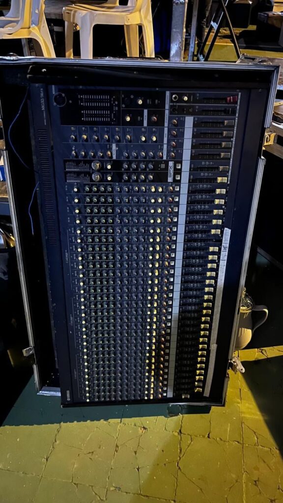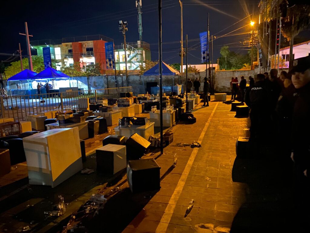 La frustración del público derivó en el lanzamiento de botellas y objetos contundentes hacia el área de la discoteca Flanger, lo que ocasionó la rotura de una pantalla LED de 6×2 metros y daños a una consola Yamaha de 32 canales, propiedad del organizador Ever Farías Domínguez, conocido como “Bato”, quien abandonó el lugar tras el hecho.