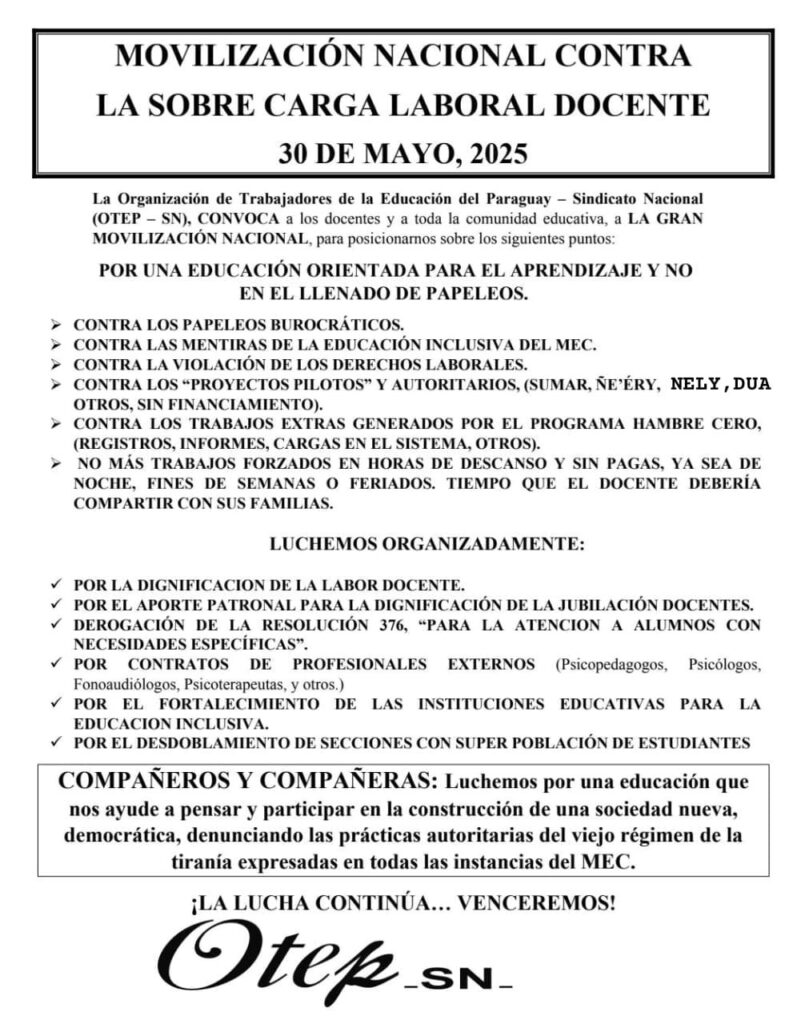 La Organización de Trabajadores de la Educación del Paraguay – Sindicato Nacional (OTEP-SN) anunció una gran movilización nacional para el próximo 30 de mayo, con el objetivo de visibilizar el creciente descontento del sector docente ante la sobrecarga laboral, las tareas burocráticas excesivas y la falta de condiciones dignas para el ejercicio profesional.