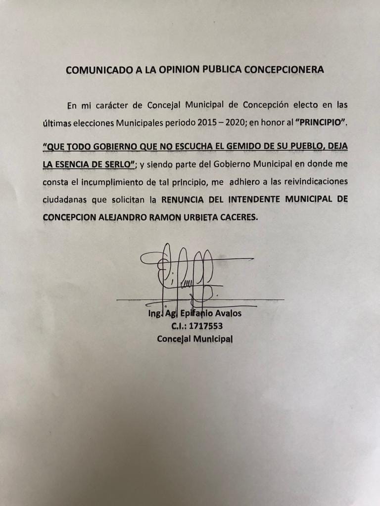 Ese esta manera ya son 6 los ediles que se suman al pedido del grupo de ciudadanos que también exigen la renuncia del Ejecutivo municipal.