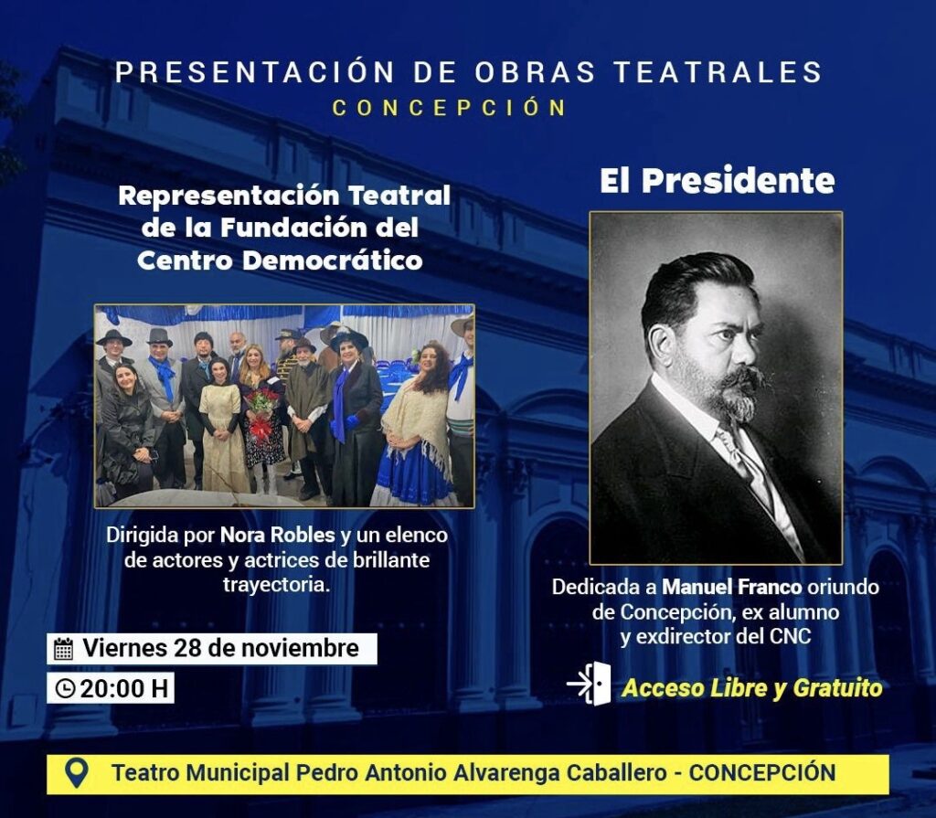Dos obras serán presentadas en el Teatro Municipal: una representación sobre la fundación del Centro Democrático y la obra “El Presidente”, dedicada al concepcionero Manuel Franco. El acceso será libre y gratuito.