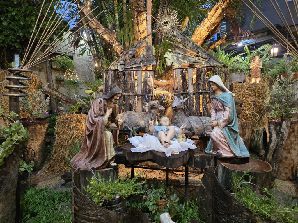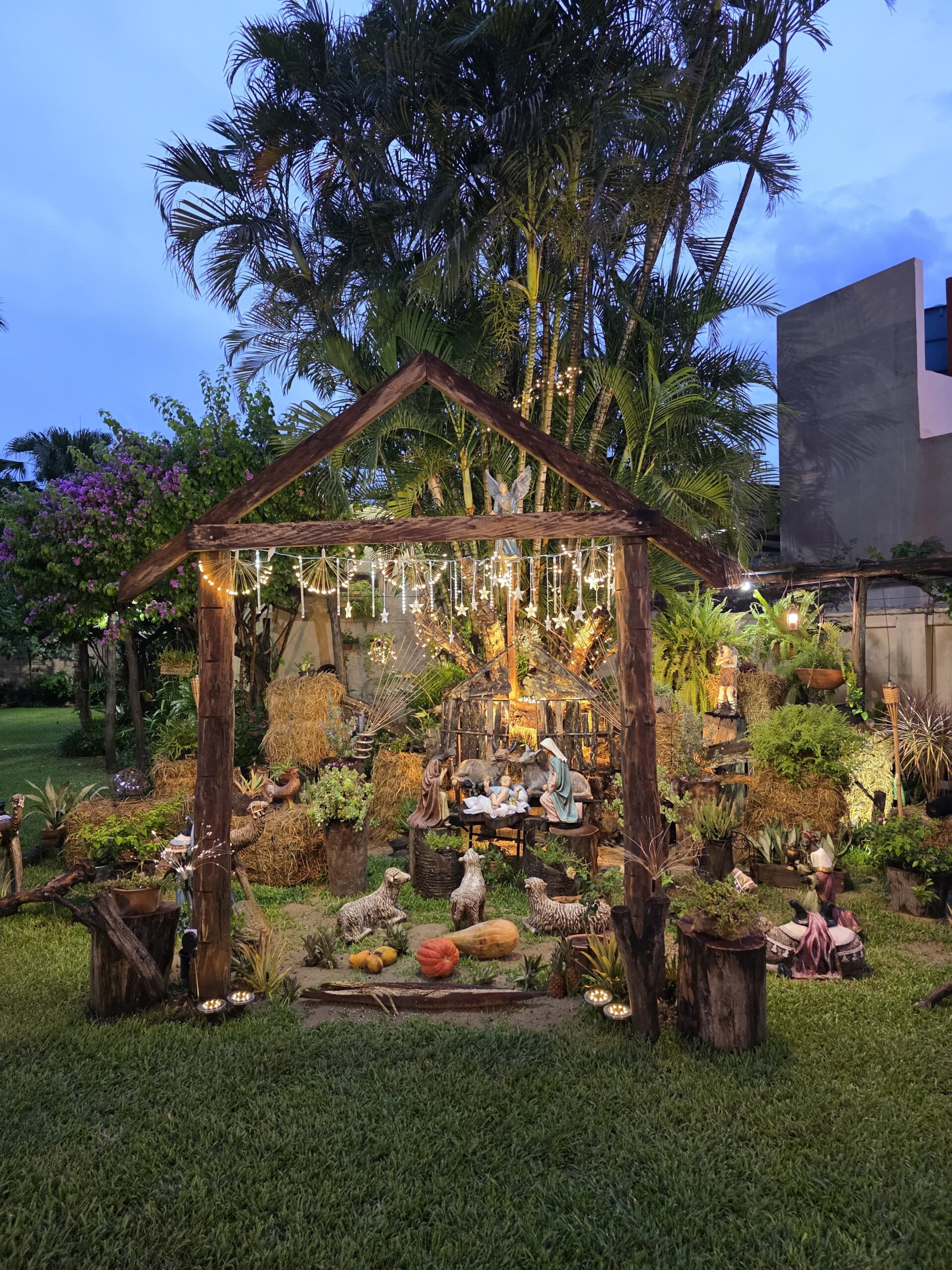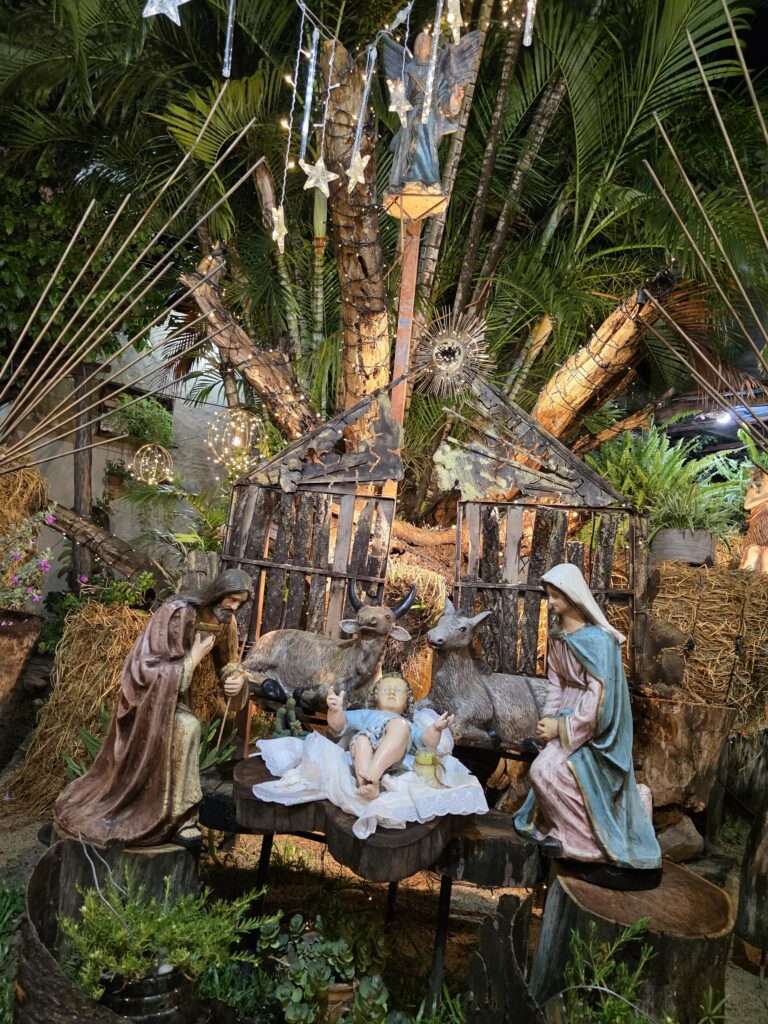 A simple vista, el pesebre se destaca por su integración con la naturaleza. La escena del nacimiento se encuentra rodeada de árboles, plantas vivas, troncos, fardos de pasto y elementos rústicos que recrean un ambiente cálido y armonioso. La estructura principal, construida con madera y materiales naturales, enmarca el nacimiento de Jesús y guía la mirada hacia el centro del mensaje.