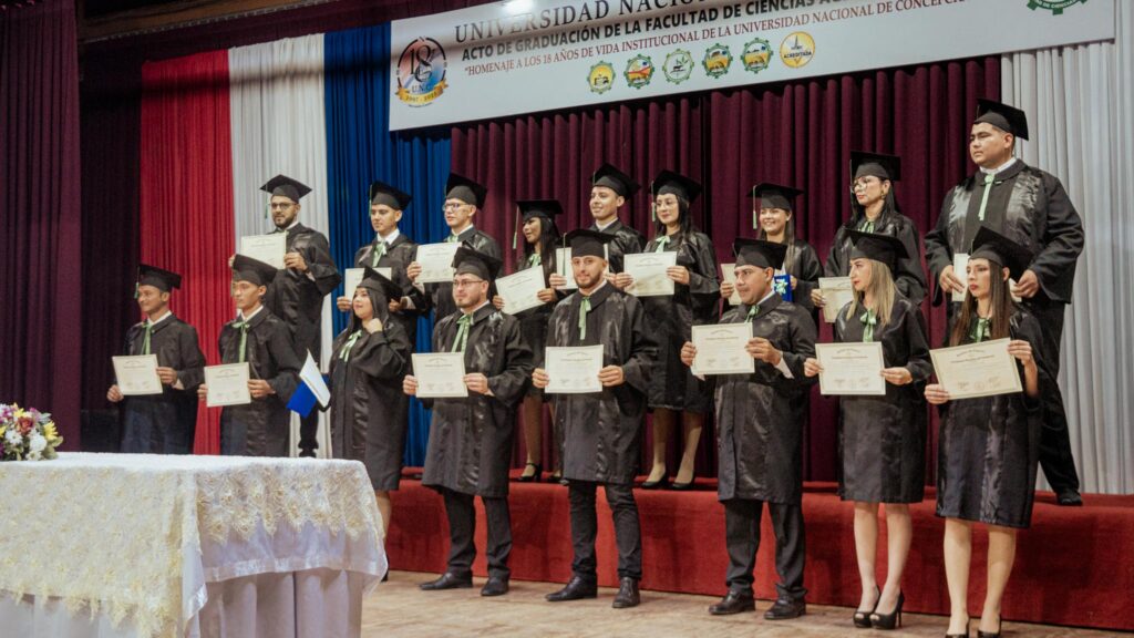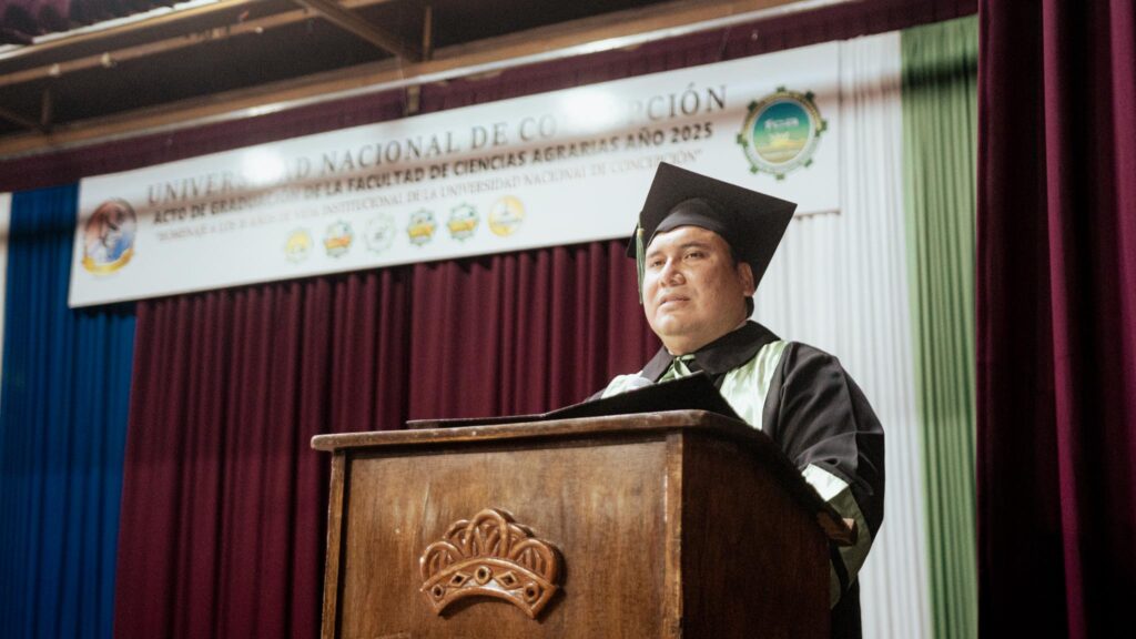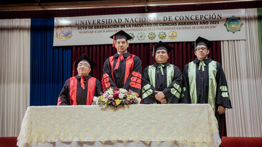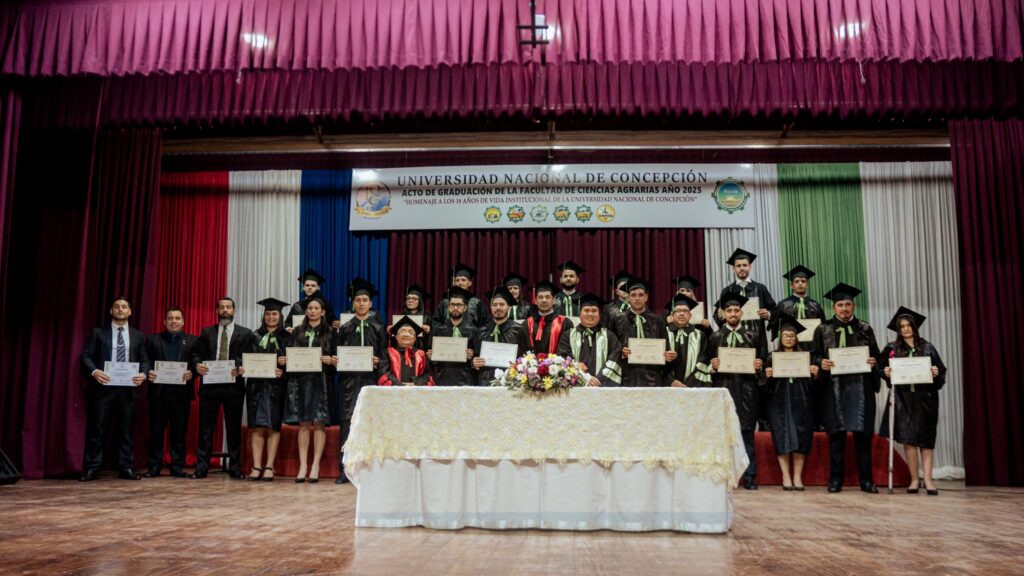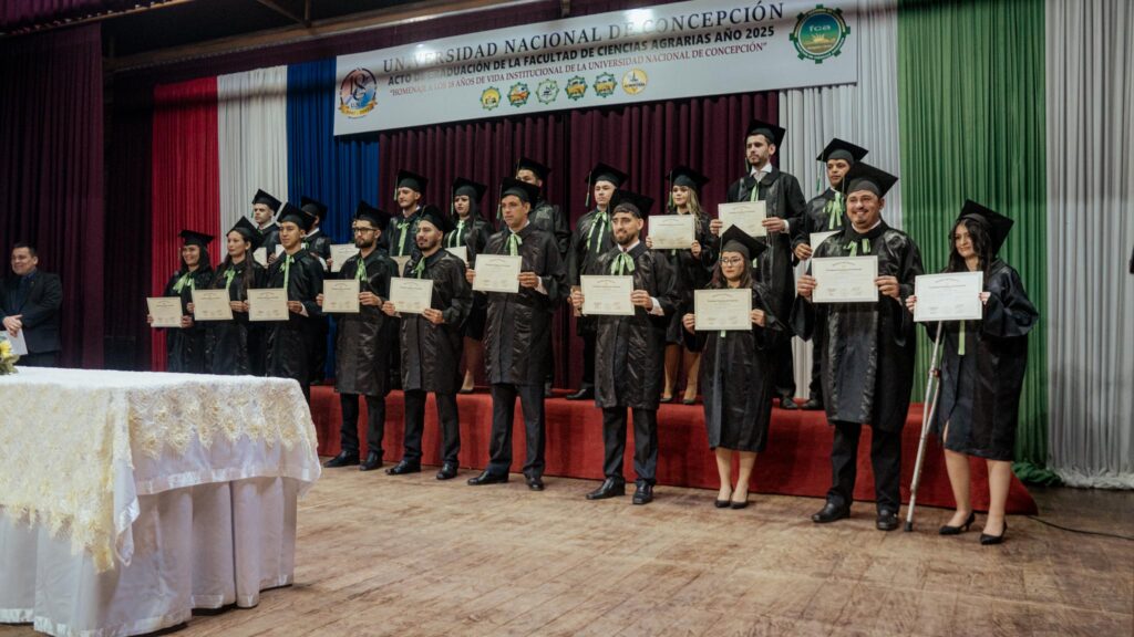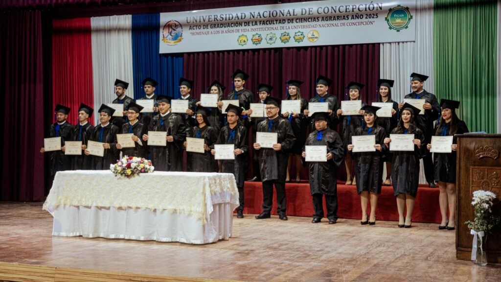 La Facultad de Ciencias Agrarias de la Universidad Nacional de Concepción celebró este martes 29 de julio su solemne acto de graduación, en una ceremonia cargada de emoción y simbolismo que tuvo lugar en el Teatro Municipal de Concepción. En la ocasión, egresaron 82 nuevos profesionales de las carreras de Ingeniería Agronómica, Licenciatura en Administración de Agronegocios y Licenciatura Administración Agropecuaria de las sedes Concepción, Horqueta, Yby Ya’u y Fuerte Olimpo.