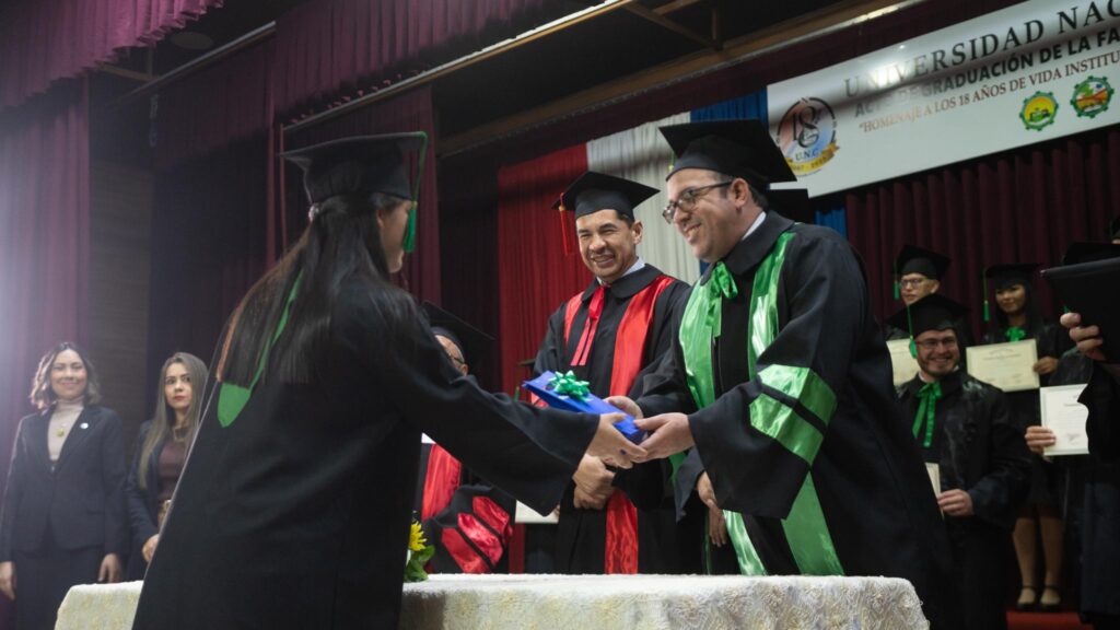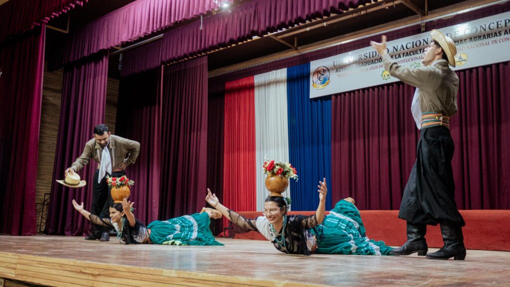 El acto culminó con el tradicional juramento profesional y una presentación artística del elenco Agro Jeroky Rory, que ofreció una colorida interpretación de danzas tradicionales como “Galopera”, “Che Parahekue” y “Che la Reina”. Como broche de oro, el Ing. Agrónomo José Colmán, egresado de la Facultad, emocionó al público con su interpretación de las canciones “A mi manera” y “Che Kamba Resajajái”, coronando así una jornada inolvidable para toda la comunidad académica y regional.