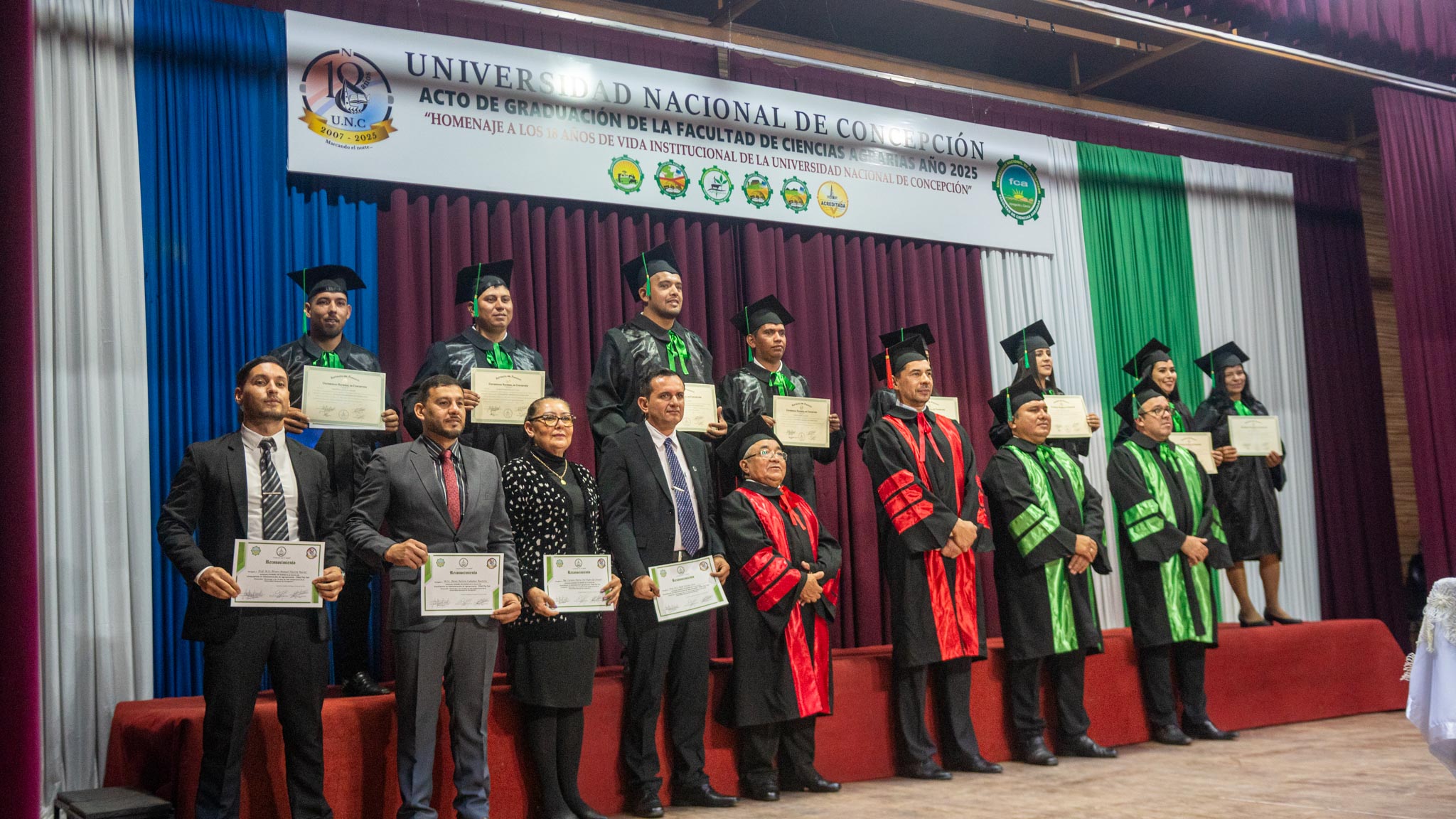 La Facultad de Ciencias Agrarias de la Universidad Nacional de Concepción celebró este martes 29 de julio su solemne acto de graduación, en una ceremonia cargada de emoción y simbolismo que tuvo lugar en el Teatro Municipal de Concepción. En la ocasión, egresaron 82 nuevos profesionales de las carreras de Ingeniería Agronómica, Licenciatura en Administración de Agronegocios y Licenciatura Administración Agropecuaria de las sedes Concepción, Horqueta, Yby Ya’u y Fuerte Olimpo.