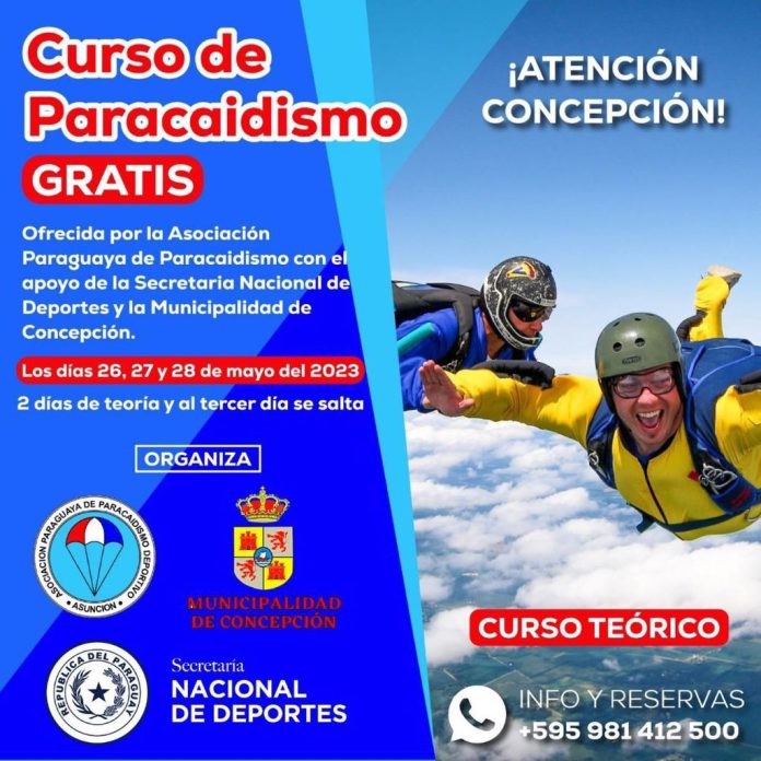 La Asociación Paraguaya de Paracaidismo Deportivo (APPD), en colaboración con la Secretaría Nacional de Deportes (SND) y la Municipalidad de Concepción, ofrecerá un curso gratuito de paracaidismo en la ciudad de Concepción.