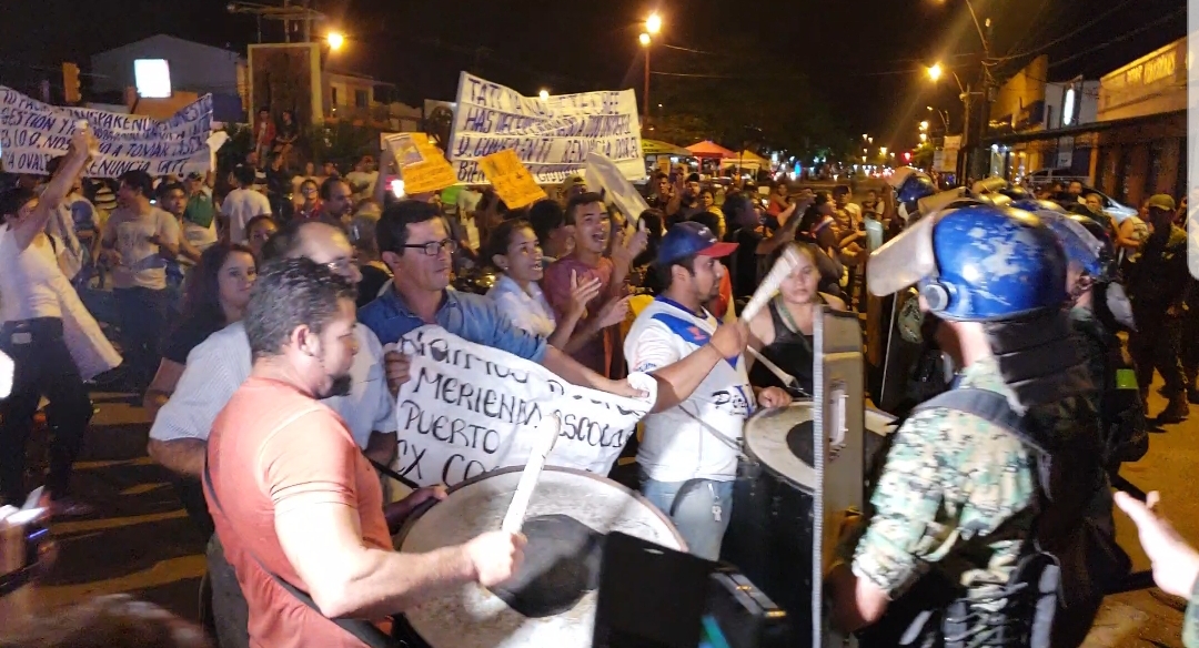 Luego marcharon por la avenida Pinedo e intentaron ingresar a la calle presidente Franco pero fueron despejados por los agentes policiales quienes nuevamente recurrieron a la fuerza.