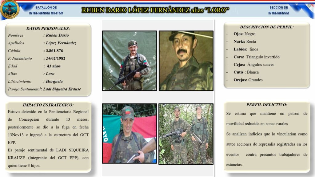 Beatriz Denis, hija del político secuestrado, afirmó que “Loro” formaba parte del anillo principal del autodenominado Ejército del Pueblo Paraguayo (EPP) y que estuvo directamente involucrado en el rapto de su padre, junto a otros cinco miembros del grupo criminal, incluyendo dos de la denominada “brigada indígena”.