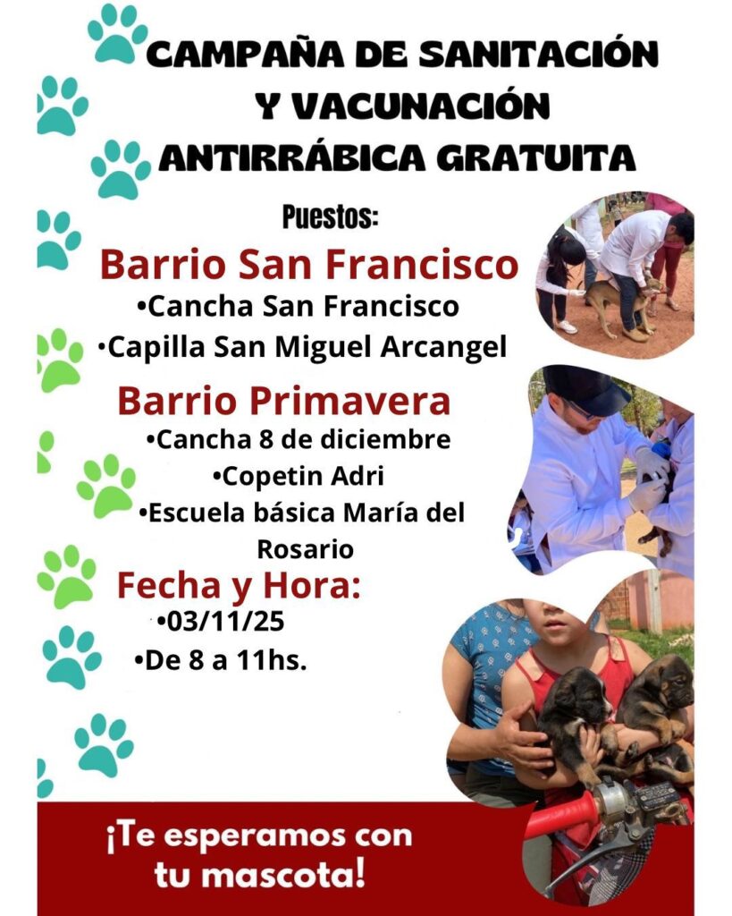 Vecinos de los barrios San Francisco y Primavera podrán acceder este 3 de noviembre a la campaña de sanidad y vacunación antirrábica gratuita para perros y gatos. Los puestos atenderán de 08:00 a 11:00 en distintos puntos estratégicos de ambos barrios. La actividad busca prevenir la rabia y promover el cuidado responsable de las mascotas.