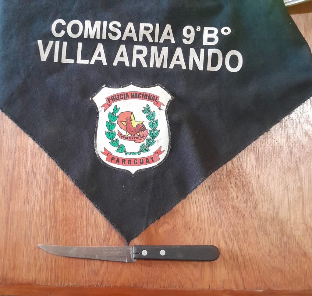 El aprehendido fue identificado como Pedro David González González, paraguayo, soltero, de 32 años de edad, domiciliado en el citado barrio. En su poder fue encontrado e incautado un arma blanca tipo cuchillo de mesa, con mango de madera color marrón y una longitud aproximada de 20 centímetros.
