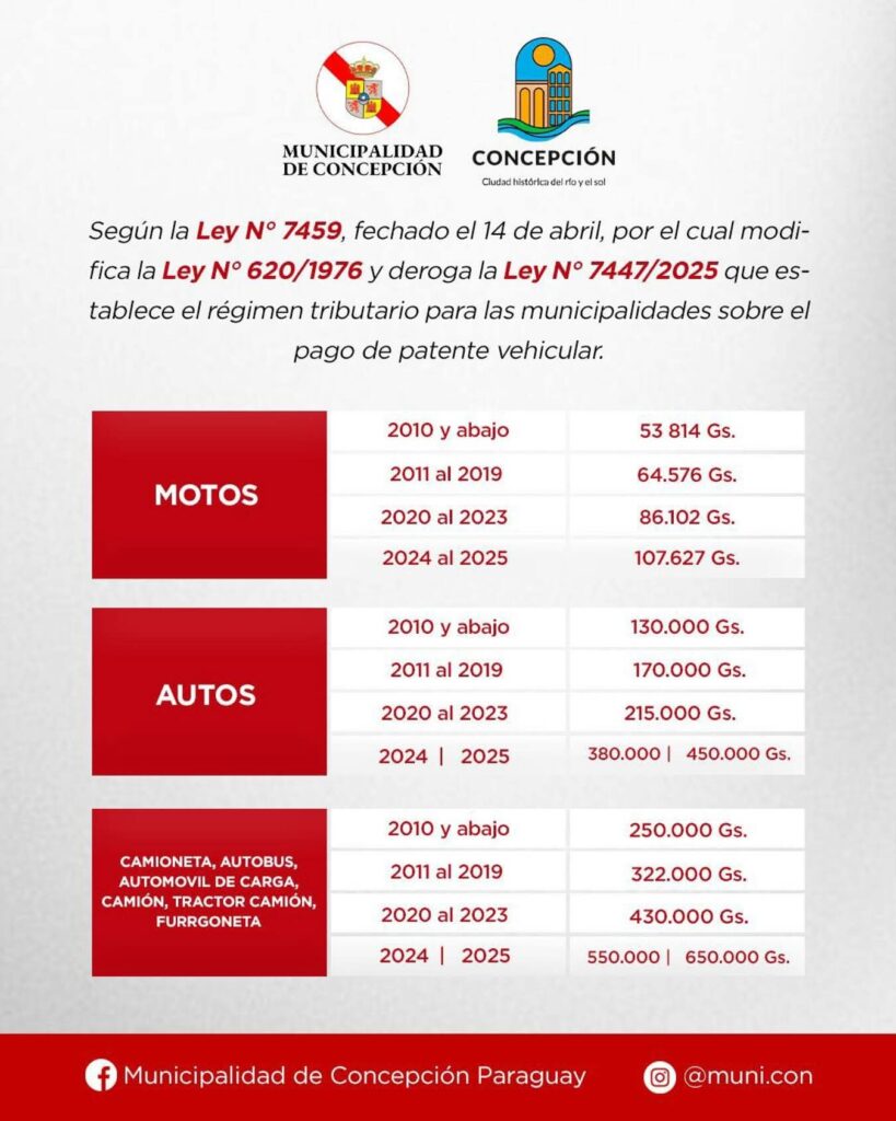 Cabe recordar que, según la Ley N° 7459 promulgada el 14 de abril de este año, se modificó el régimen tributario sobre el pago de patente vehicular establecido por la Ley N° 620/1976 y se derogó la Ley N° 7447/2025, marcando así nuevas disposiciones para las municipalidades en la gestión de este tributo.