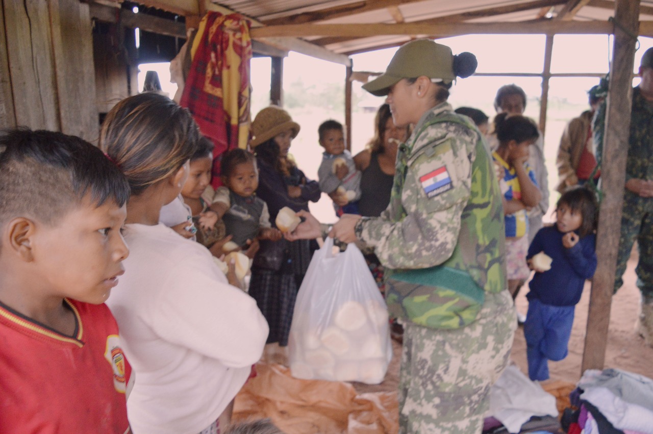 La entrega se realizó entre el martes y jueves a 15 familias del asentamiento “Núcleo 6” alcanzando a 90 personas y a 12 familias nativas de Kora- i, Punta Suerte, ubicadas en Núcleo 5, Arroyito. En este lugar fueron beneficiadas 70 personas, donde también los niños recibieron golosinas y panificados elaborados por los militares.