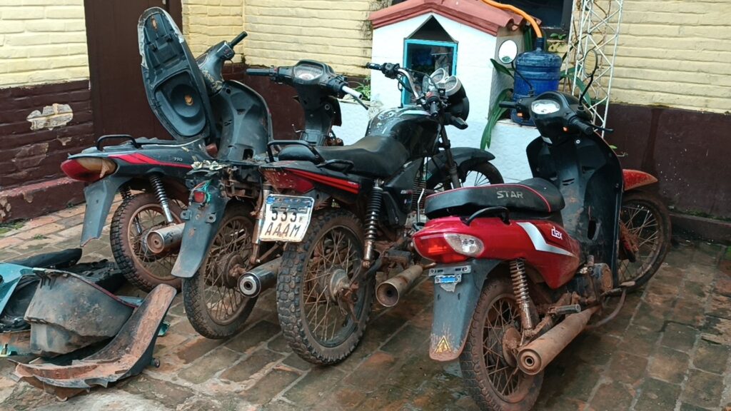 En el lugar, los uniformados hallaron dicha motocicleta, además de otras dos: una Kenton 110cc sin plásticos ni chapa, y una Leopard HT150A de color negro. También se incautaron partes sueltas como guardabarros y cajuelas, todas carentes de documentación.