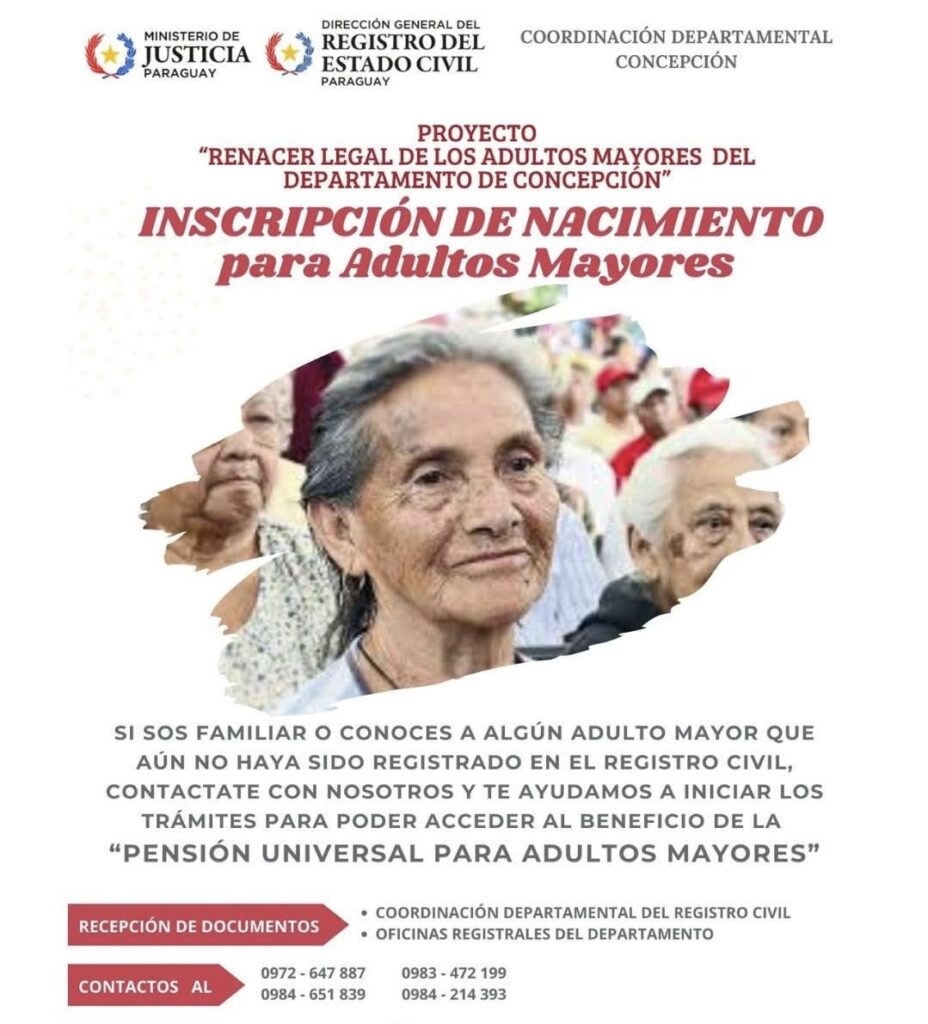 En un esfuerzo por garantizar derechos básicos y restituir la identidad de los adultos mayores, el Ministerio de Justicia, a través del Registro del Estado Civil, impulsa el proyecto “Renacer Legal de los Adultos Mayores del Departamento de Concepción”. Esta iniciativa tiene como objetivo inscribir por primera vez en el Registro Civil a personas mayores que nunca fueron registradas oficialmente.