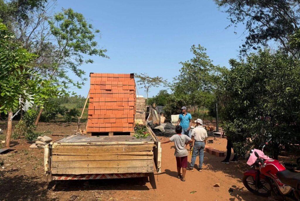 Durante la visita, la intendente entregó ladrillos y otros materiales de construcción para iniciar la reconstrucción de la vivienda afectada. La acción se realizó en presencia del presidente de la Junta Municipal, Rosalino Troche, y vecinos de la comunidad.