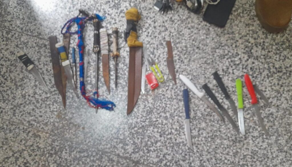 Durante la intervención, se incautaron tres dispositivos celulares Samsung (un A30 y dos A21), así como un preocupante arsenal de armas blancas, incluyendo seis cuchillos de mesa, doce cuchillos de fabricación casera y tres cuchillos tipo estoque. Además, se decomisaron diez paquetes de sustancia herbácea verdosa, aparentemente marihuana, envueltos en polietilenos, con un peso total de 1,63 gramos, junto con una bolsa de polietileno que contenía 12,42 gramos de sustancias blancas.