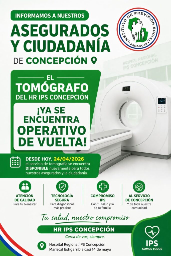 El equipo había quedado inhabilitado tras la quema de un tubo, desperfecto que obligó a suspender temporalmente los estudios en el centro asistencial. Durante ese periodo, los pacientes asegurados que necesitaban tomografías fueron derivados al Hospital Regional de Concepción, dependiente del Ministerio de Salud Pública, así como a centros privados.