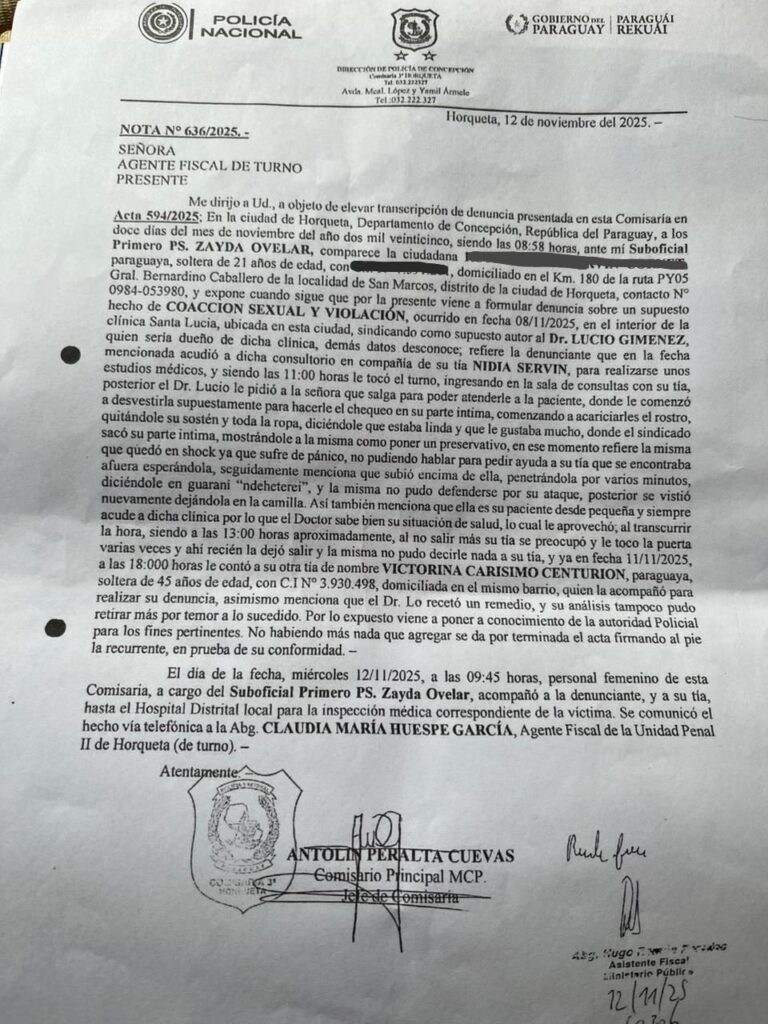 En la ciudad de Horqueta, una joven de 21 años, identificada con las siglas R.K.S.C., denunció ante la Comisaría local un grave hecho de presunta coacción sexual y violación, ocurrido en el interior de una clínica privada de la ciudad.
